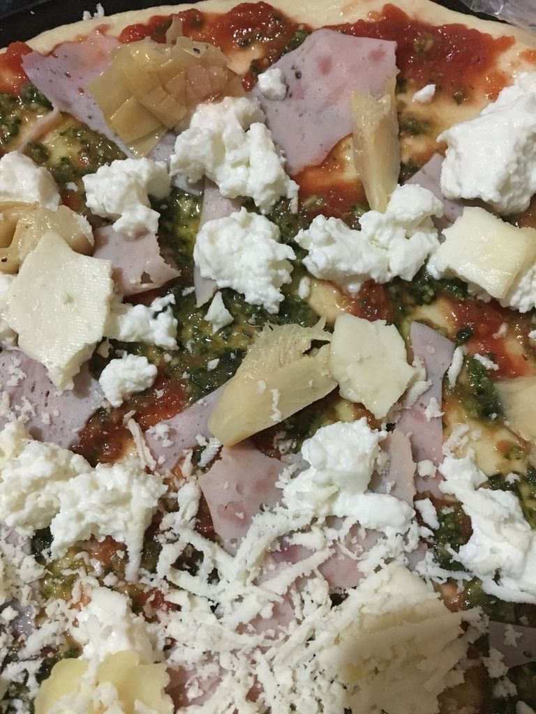 Étalez de la sauce tomate et pesto les tranches de jambon la ricotta et beaucoup de fromage, délicieuse variante par rapport aux pizzas habituelles, et en plus, vous pouvez préparer le tout en moins de 30 minutes ! Coupez la pizza en petites bouchées, cela sera parfait pour grignoter