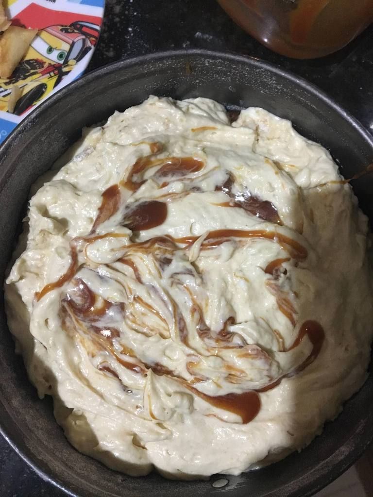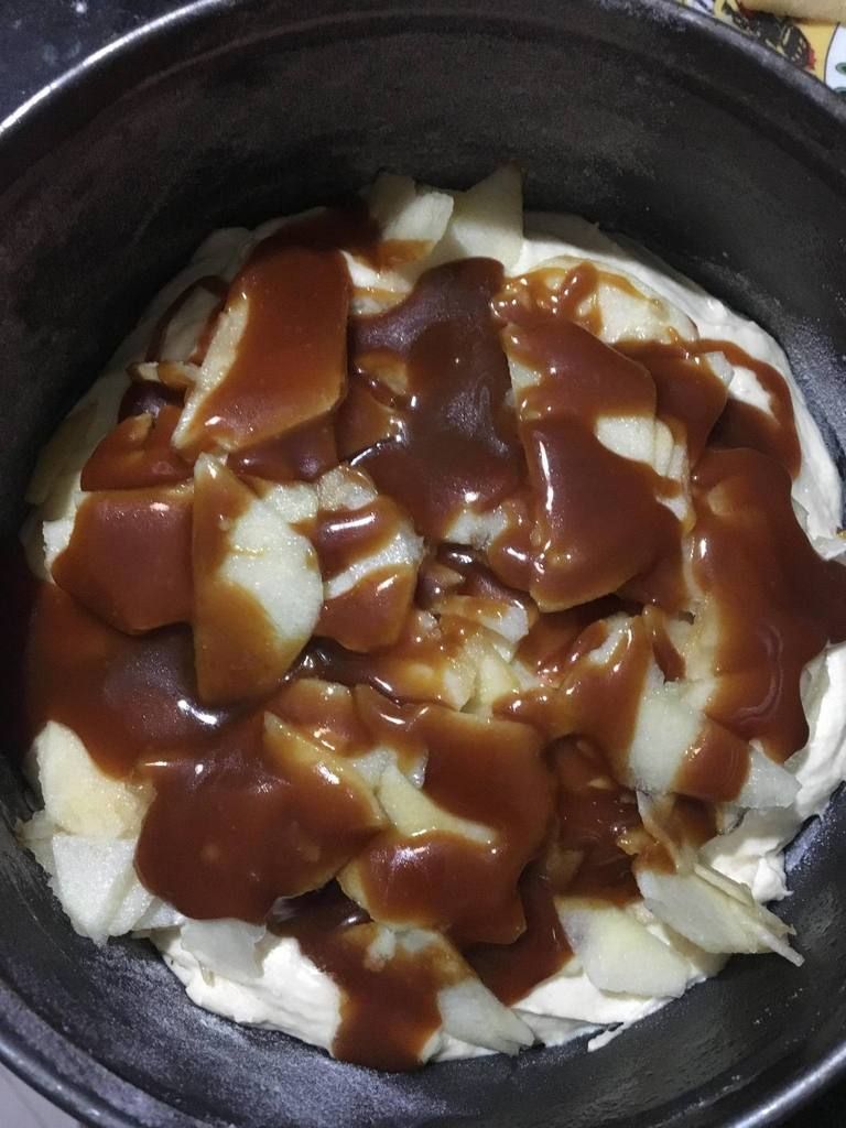 Verser la 1 partie dans un moule graissé et fariné. mettez les pommes coupés très finement en lamelles et par dessus des pommes le caramel avant de verser la 2 partie du mélange