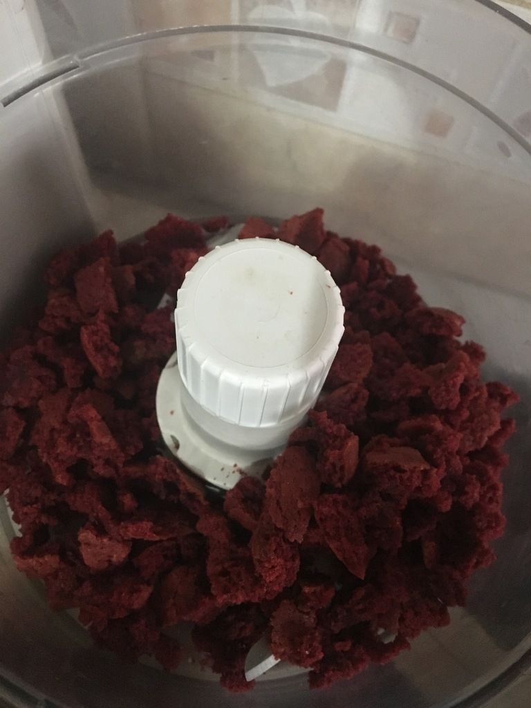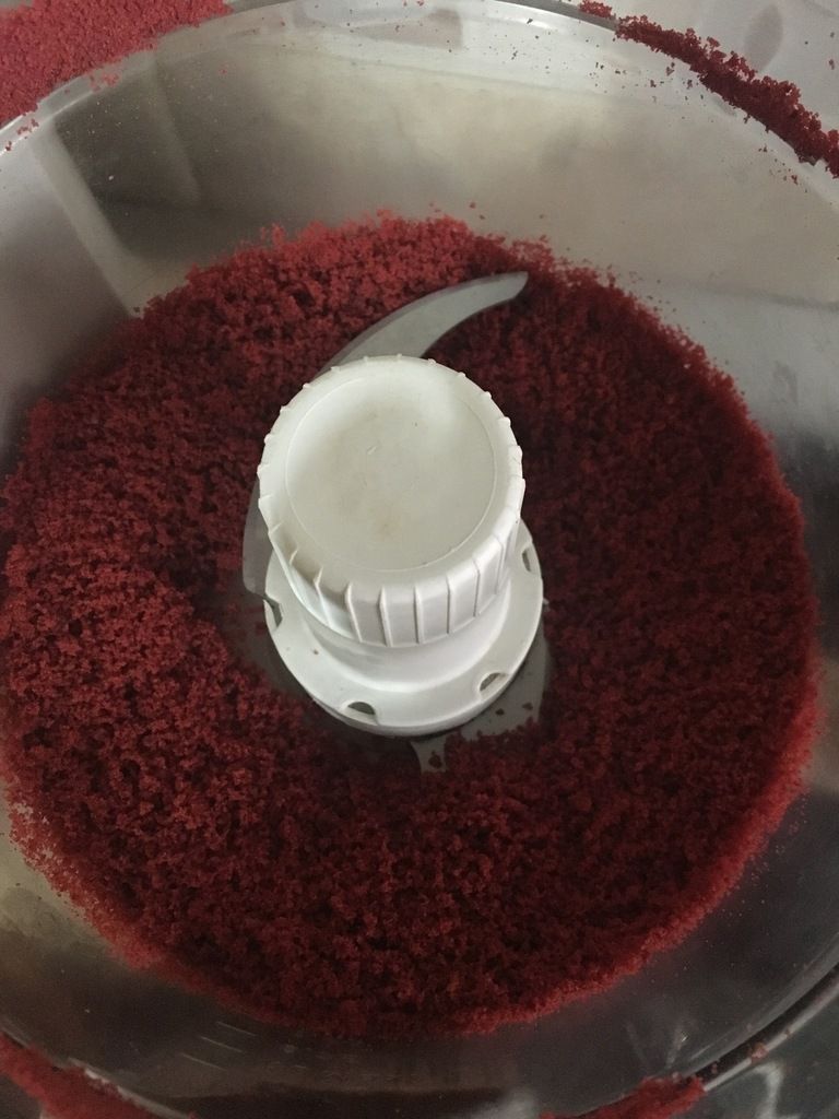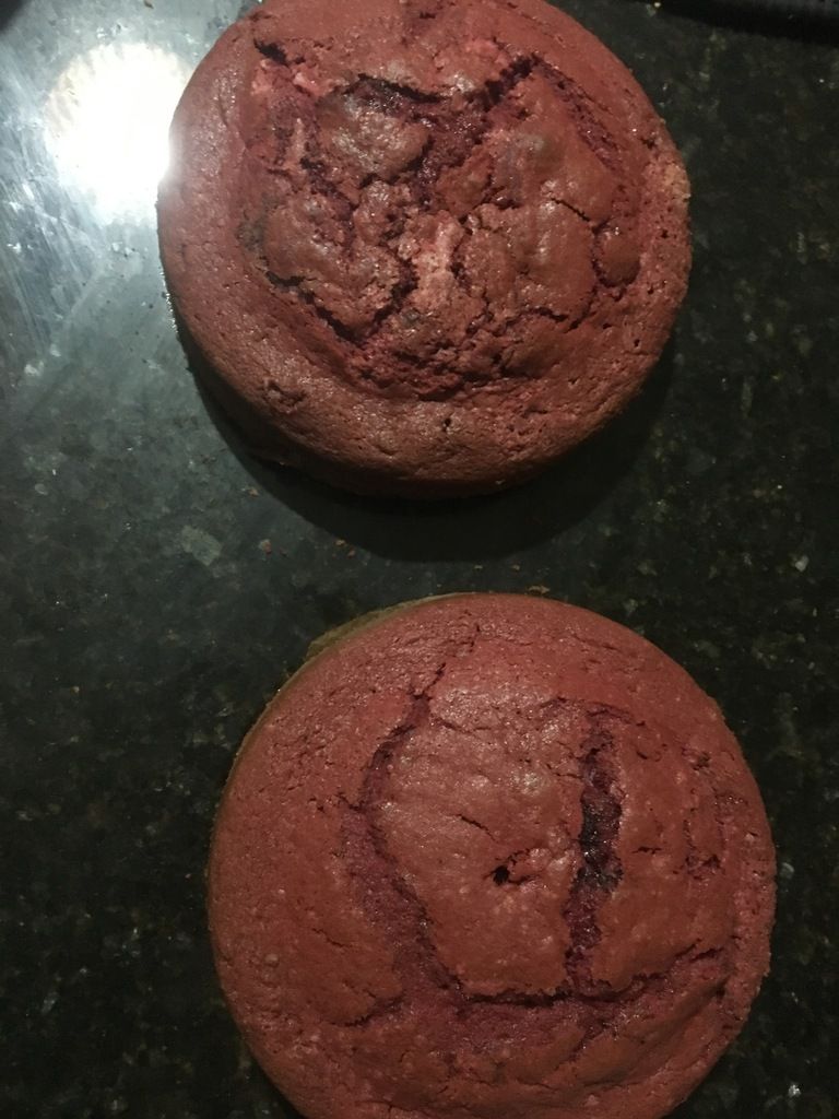 - Étape coloration: ajouter le colorant rouge en gel (ou liquide si vous avez, la quantité est à évaluer!). Bien mélanger pour homogénéiser la couleur. Terminer en ajoutant le sel et le bicarbonate de soude. Répartir la pâte obtenue dans 2 moules de 15cm .