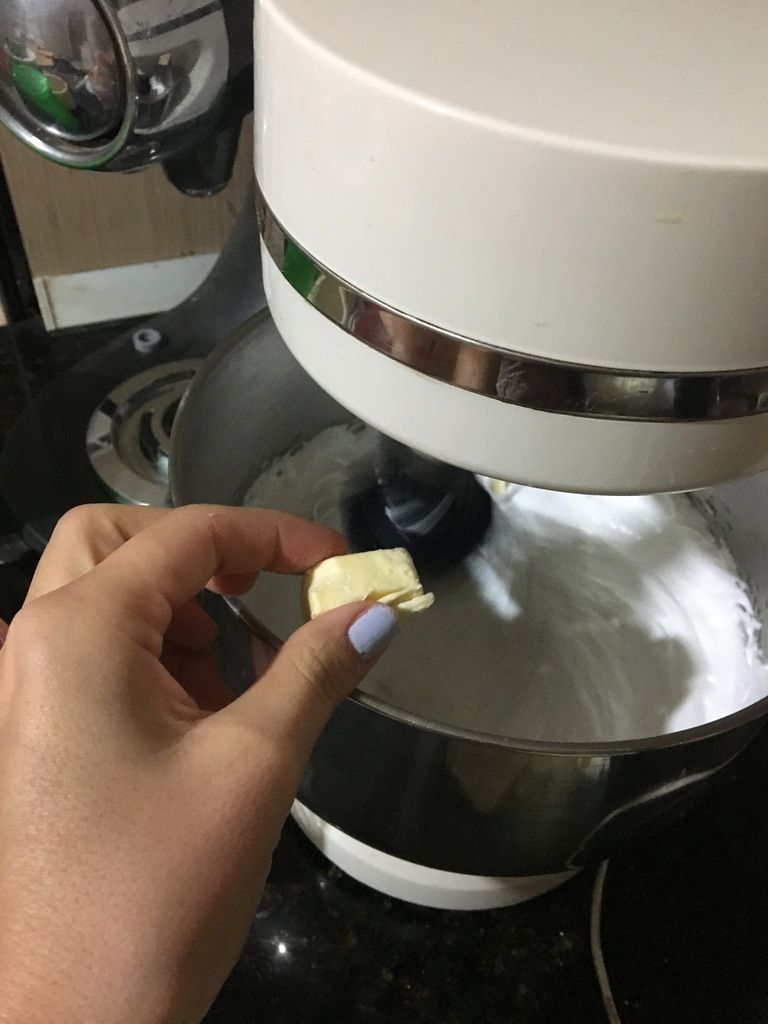 - Une fois tout le sirop de sucre incorporé, montez la vitesse de votre robot au maximum laissez le continuer de fouetter jusqu’à ce que votre appareil épaississe et refroidisse entièrement. Vous obtenez alors une Meringue Italienne bien brillante et blanche. continuez bien à la fouetter jusqu’à ce que votre bol soit à température ambiante, vous pouvez vérifier avec vos mains), ajoutez petit à petit le beurre mou. Cela peut prendre jusqu’à 5 minutes facile.