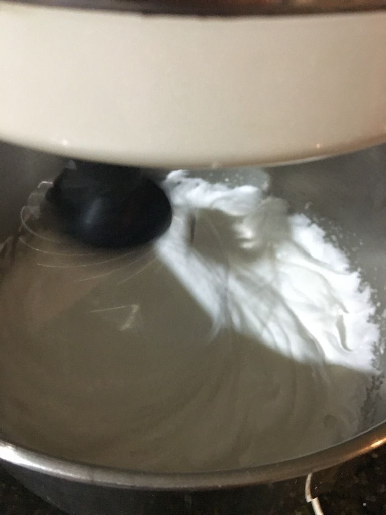 Lorsque votre sirop de sucre atteint les 121 °C,( ou bien tester avec votre doigt si c’est un peu collant faites attention de ne pas se bruler ) enlevez le immédiatement du feu et versez le doucement vers la paroi du bol de votre robot (afin d’éviter tout risque d’éclaboussures et donc de brûlures !) afin qu’il se mélange à vos blanc d’oeufs en neige (qui continuent d’être fouettés).