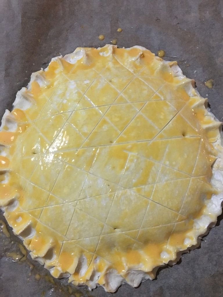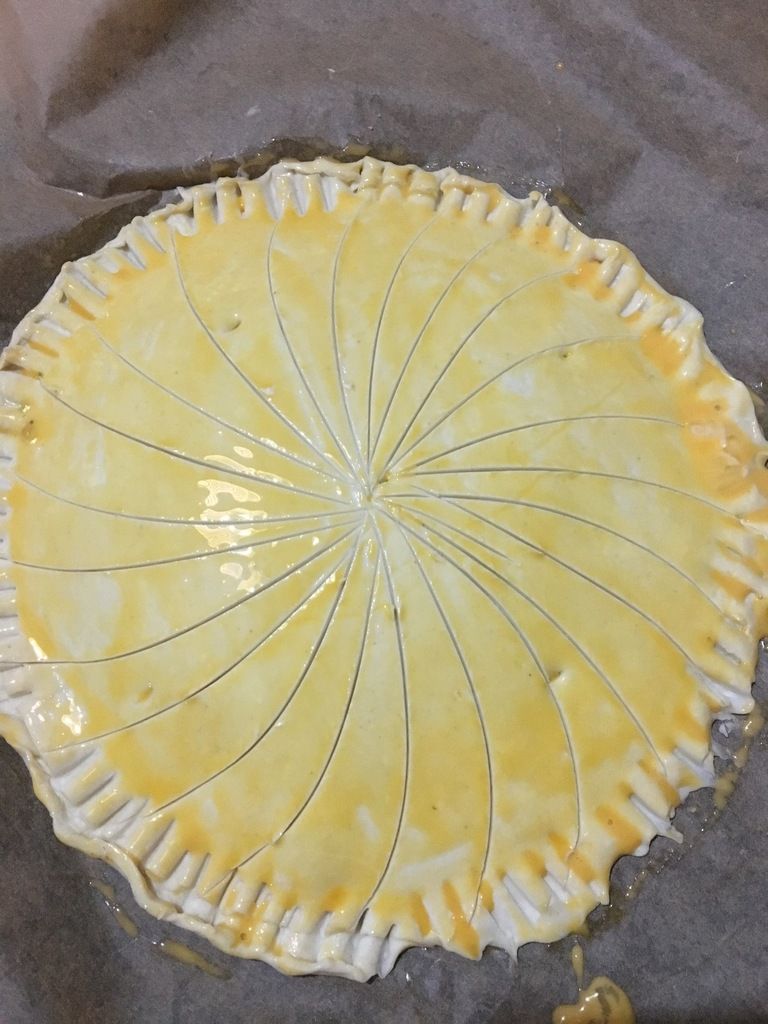 - Placez une fève par galette ( jai pas mis )dans la frangipane, puis placez un rond de feuilletage diamètre 20 cm par-dessus et fermez les galettes en les soudant à l'aide de la tranche de la main sans trop appuyer afin de ne pas casser les feuillets de pâte.