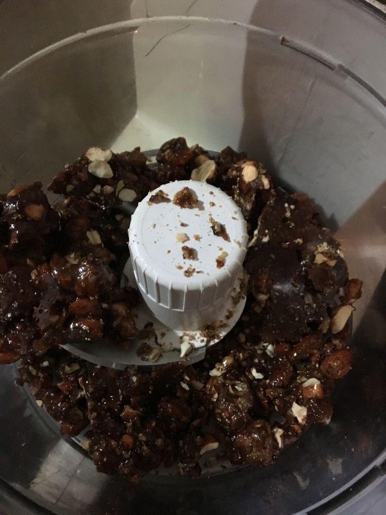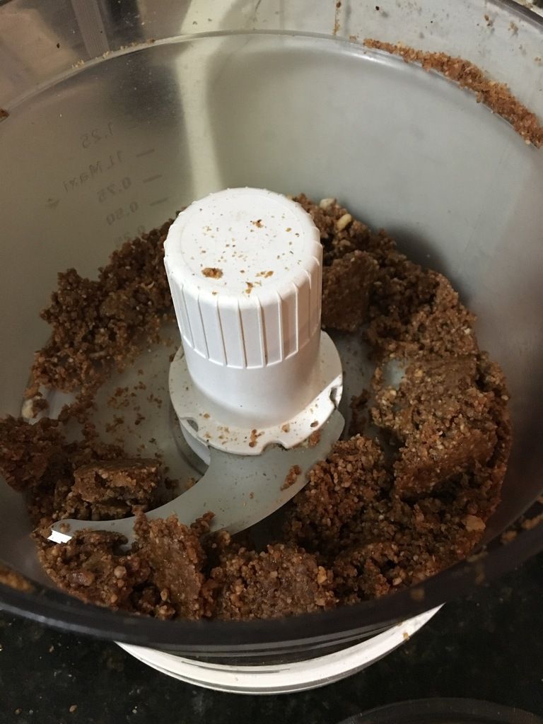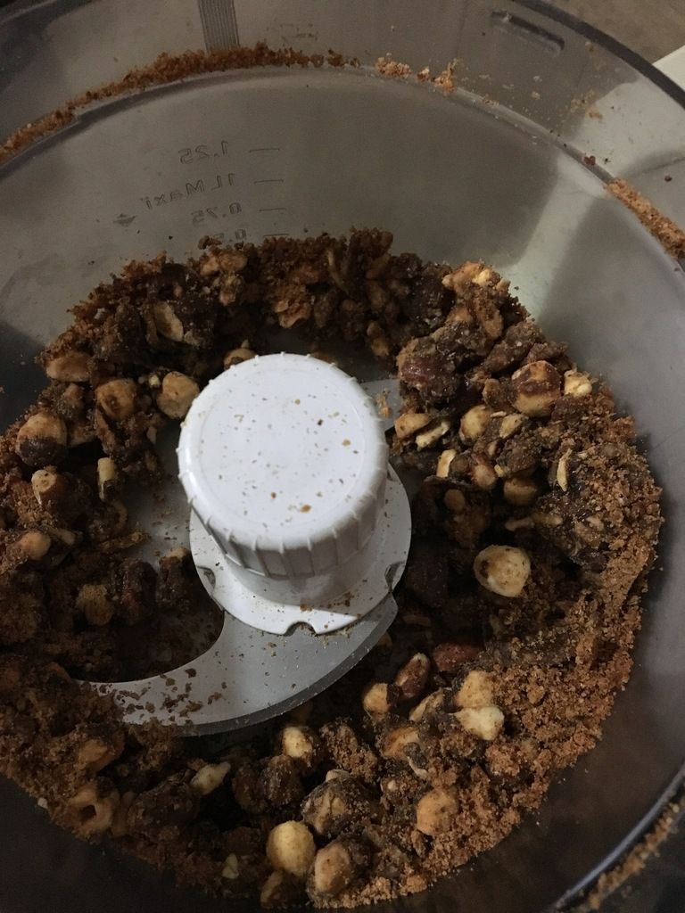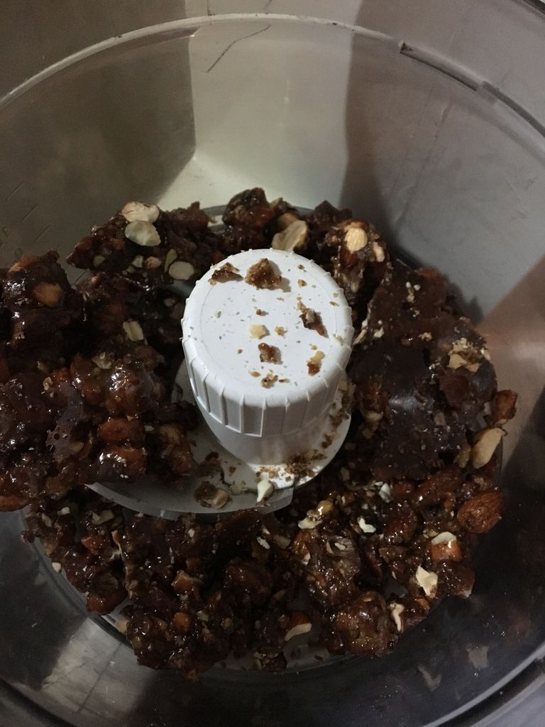Concasser grossièrement cette plaque caramélisée et déposer les morceaux dans le bol du robot muni de sa lame.
