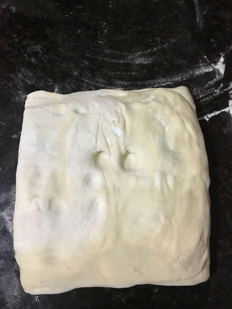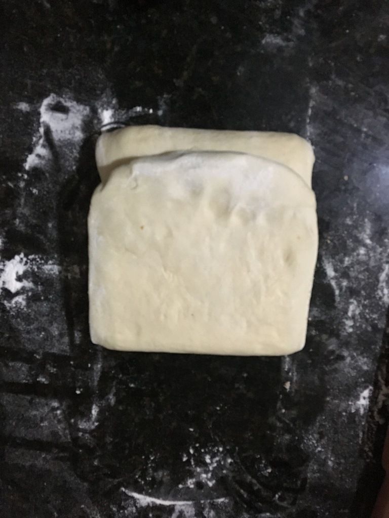 Tournez le pâton de pâte d'un quart de tour, puis faites de même pour le second quartier, et ainsi de suite jusqu'au quatrième, de façon à obtenir un carré de pâte.