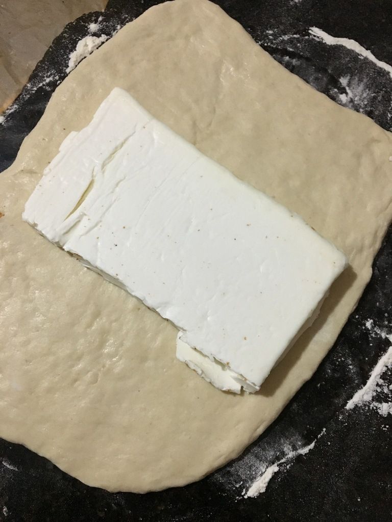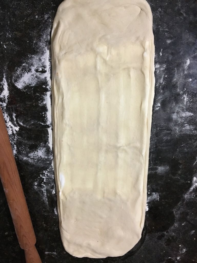 A l'aide du rouleau à pâtisserie, tapotez légèrement l'ensemble pour que la pâte s'affaisse, puis abaissez (étalez) celle-ci, de manière à obtenir un rectangle de 30 à 40 cm de long sur 15 cm de large.