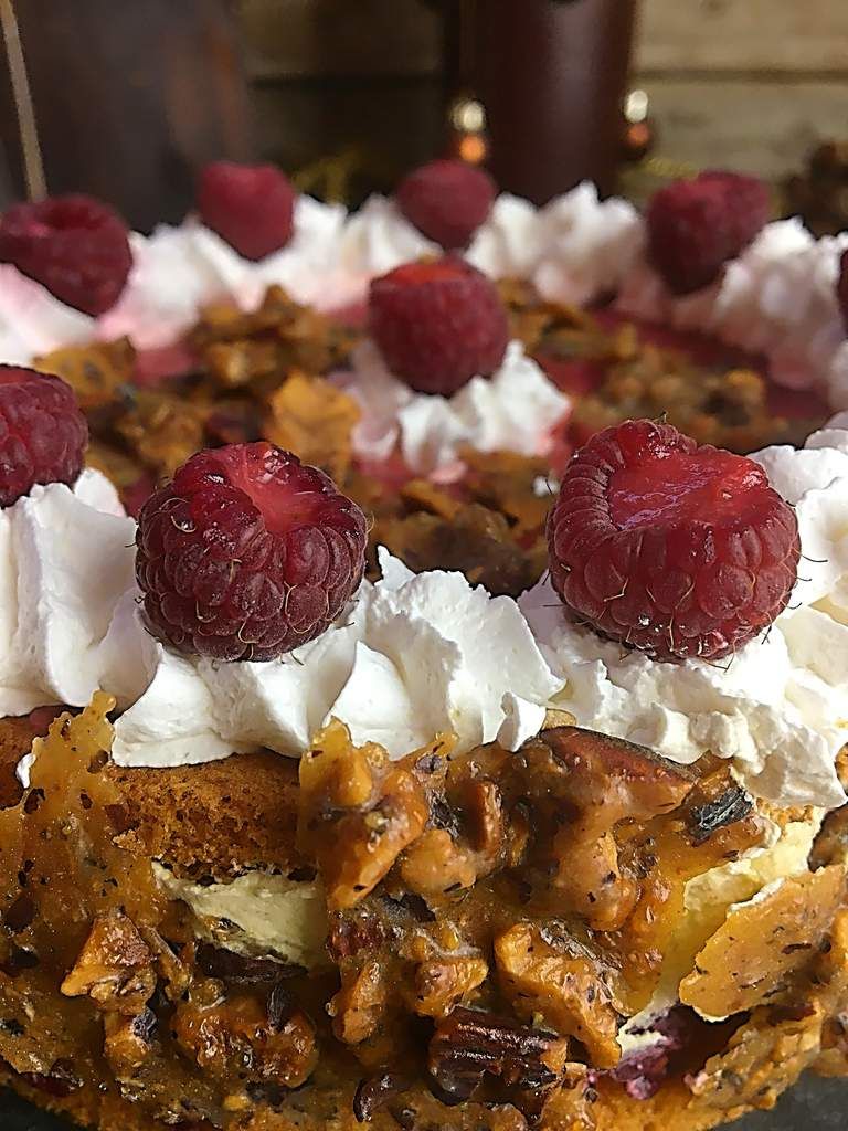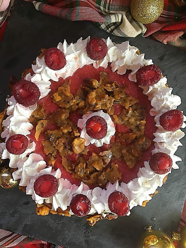Verser par-dessus la gèle et décorer avec de la chantilly et de la framboise et croquant au fruit sec