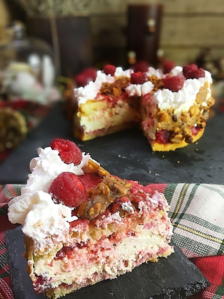 5. Mettez dessus les framboises de façon à recouvrir tout le gâteau et le croquant fruit rouge chocolat blanc achetée tout prêt