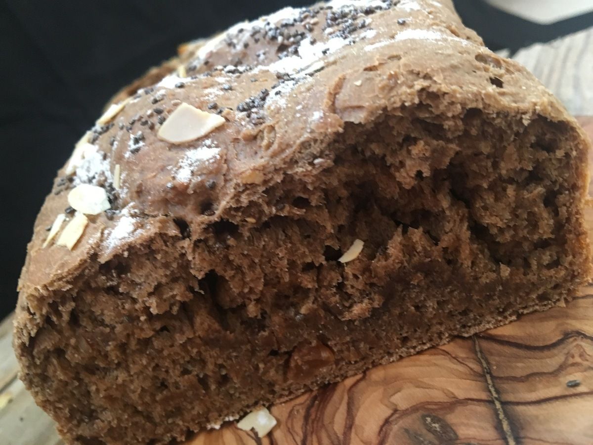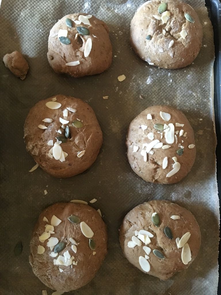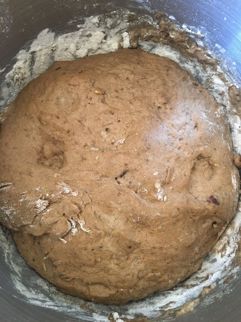 En fin de pétrissage, j'incorpore les fruits secs grossièrement écrasées à la pâte jusqu'à ce qu'elles soient bien répartis.