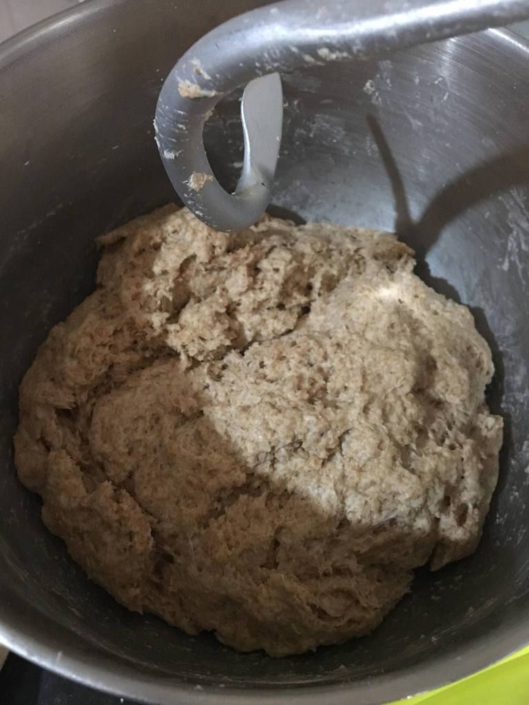 - ajoute le mélange du petit saladier dans le grand et pétris le tout énergiquement pendant une dizaine de minutes jusqu’à ce que la pâte devienne homogène et élastique