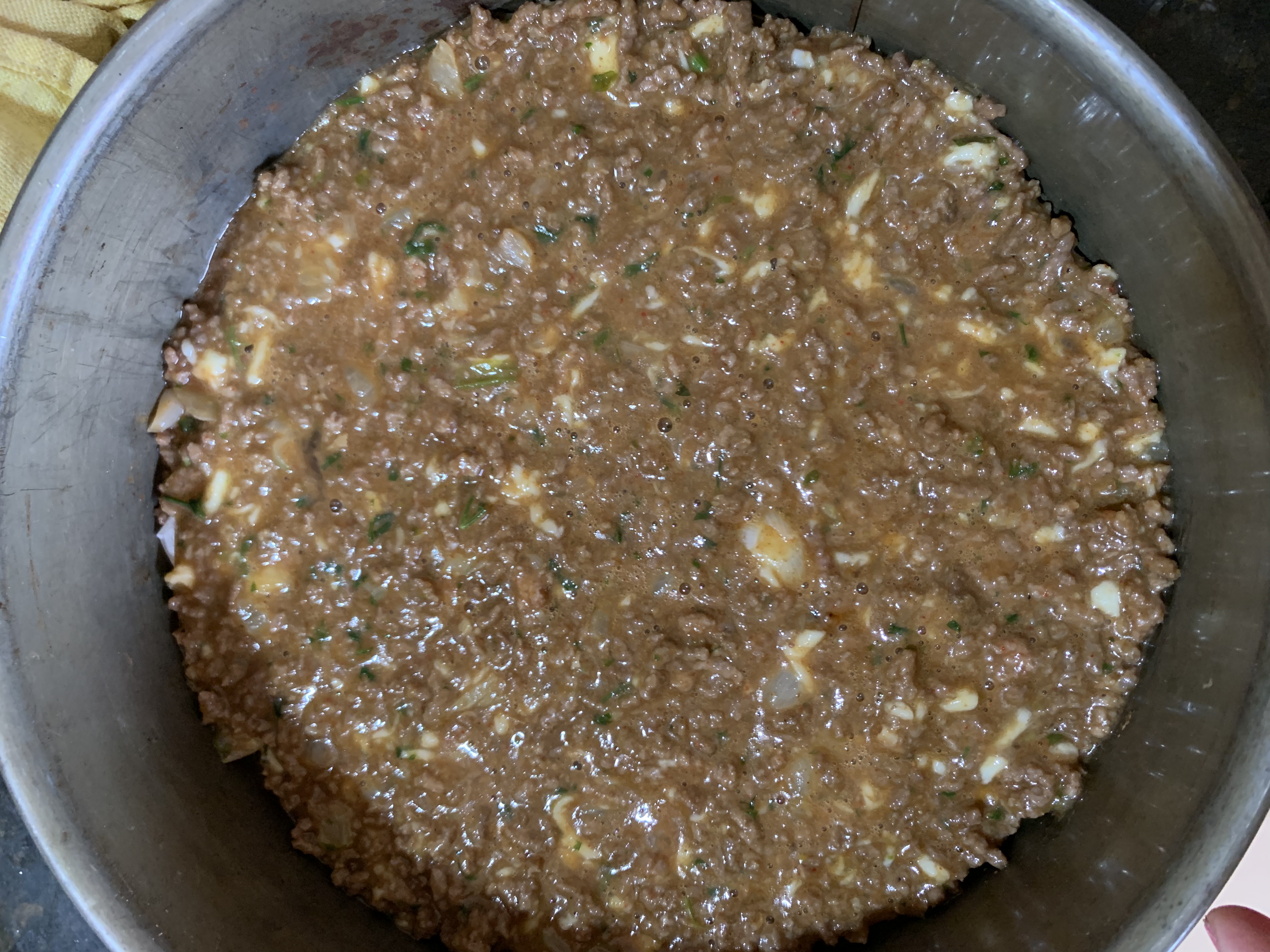 Faites revenir la viande hachée dans un peu d’huile, avec l’oignon et l’ail écrasé. Salez et poivrez, ajoutez les épices , bien mélangez.