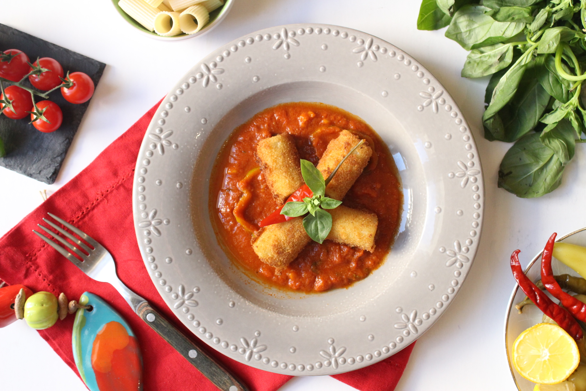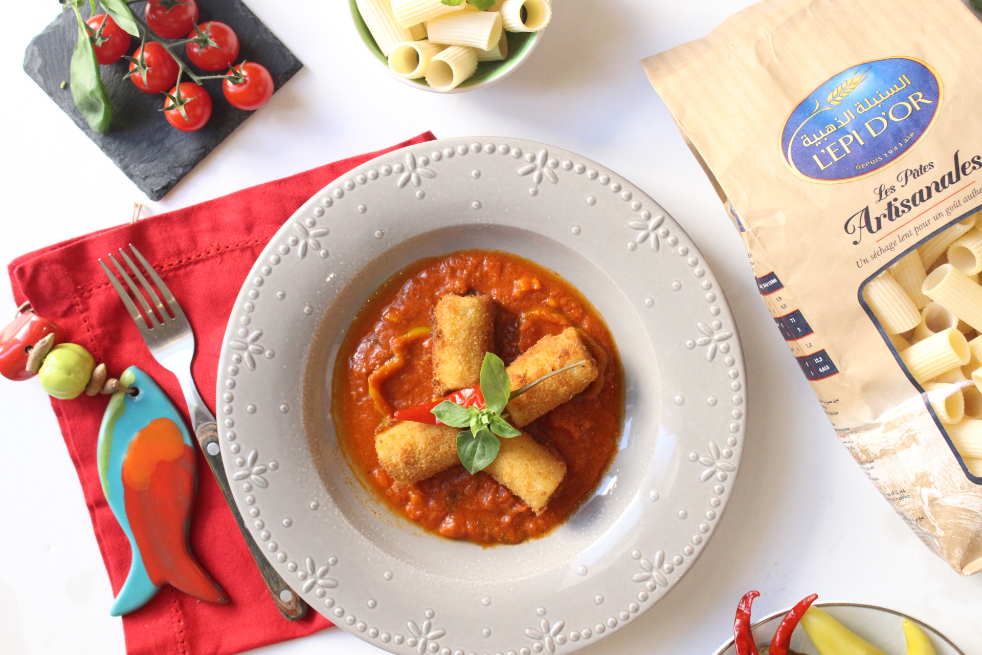 - Servir sur la sauce tomate et placer les pates et garnir de quelques feuilles de basilic.