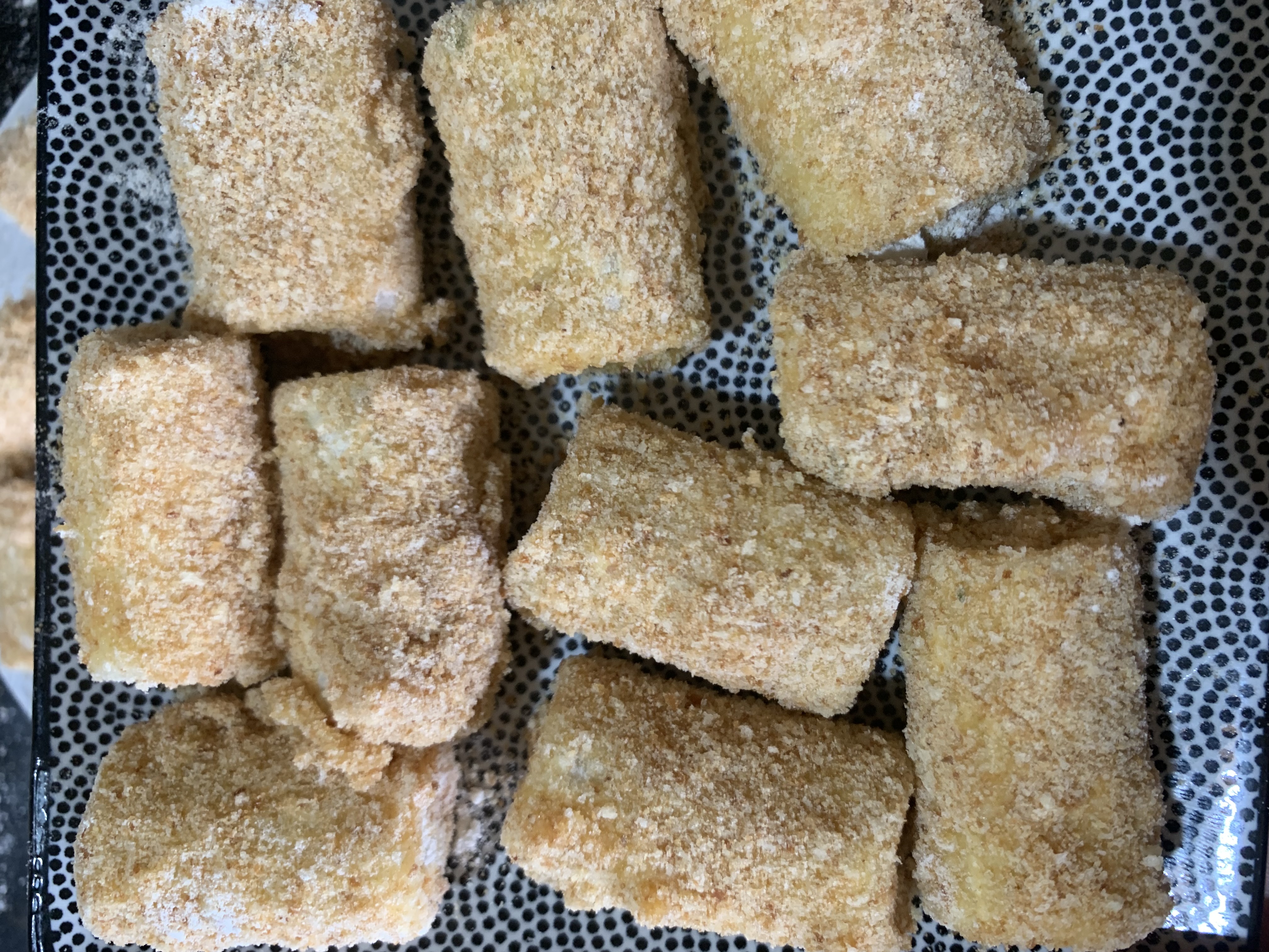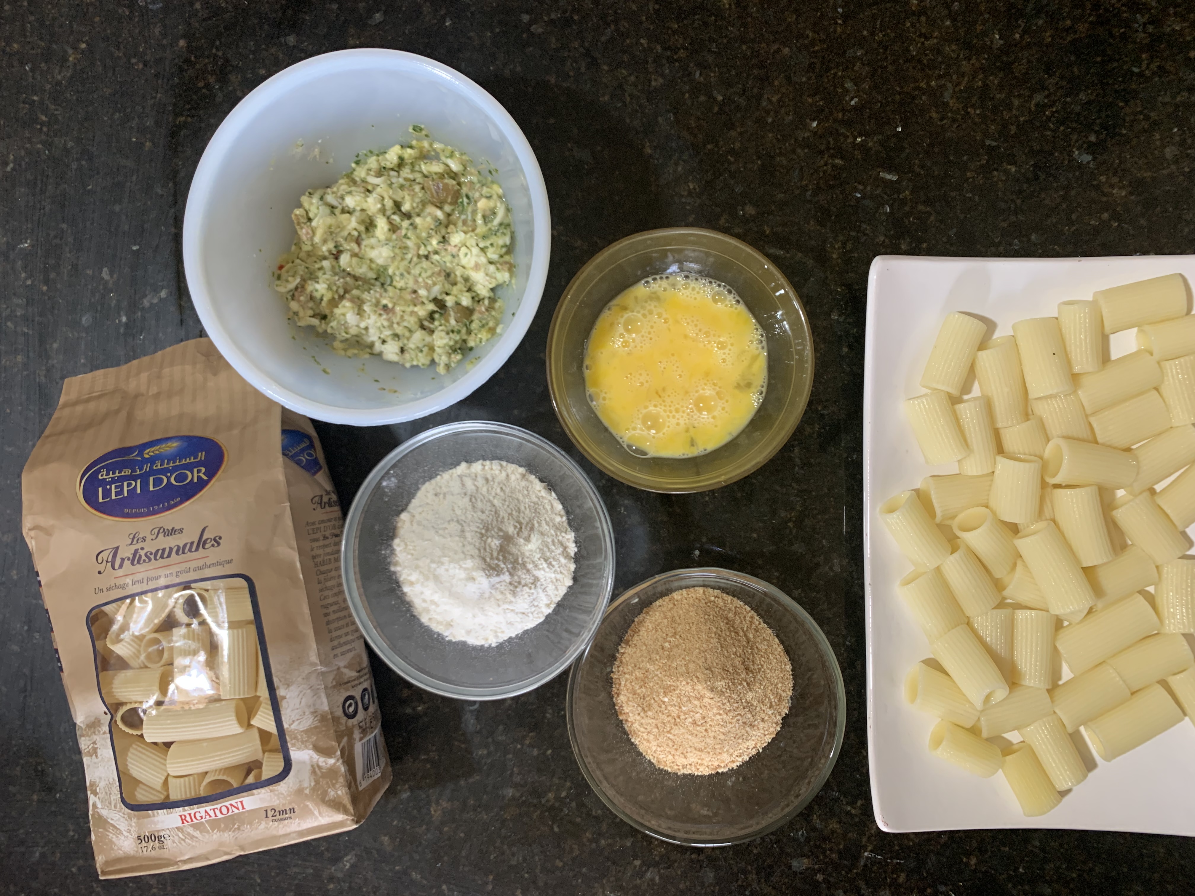 Prendre chaque rigatoni le farcir le passer d'abord dans l'œuf, puis dans la farine après la chapelure en prenant soin de bien couvrir les côtés, de sorte que la garniture puisse sortir.