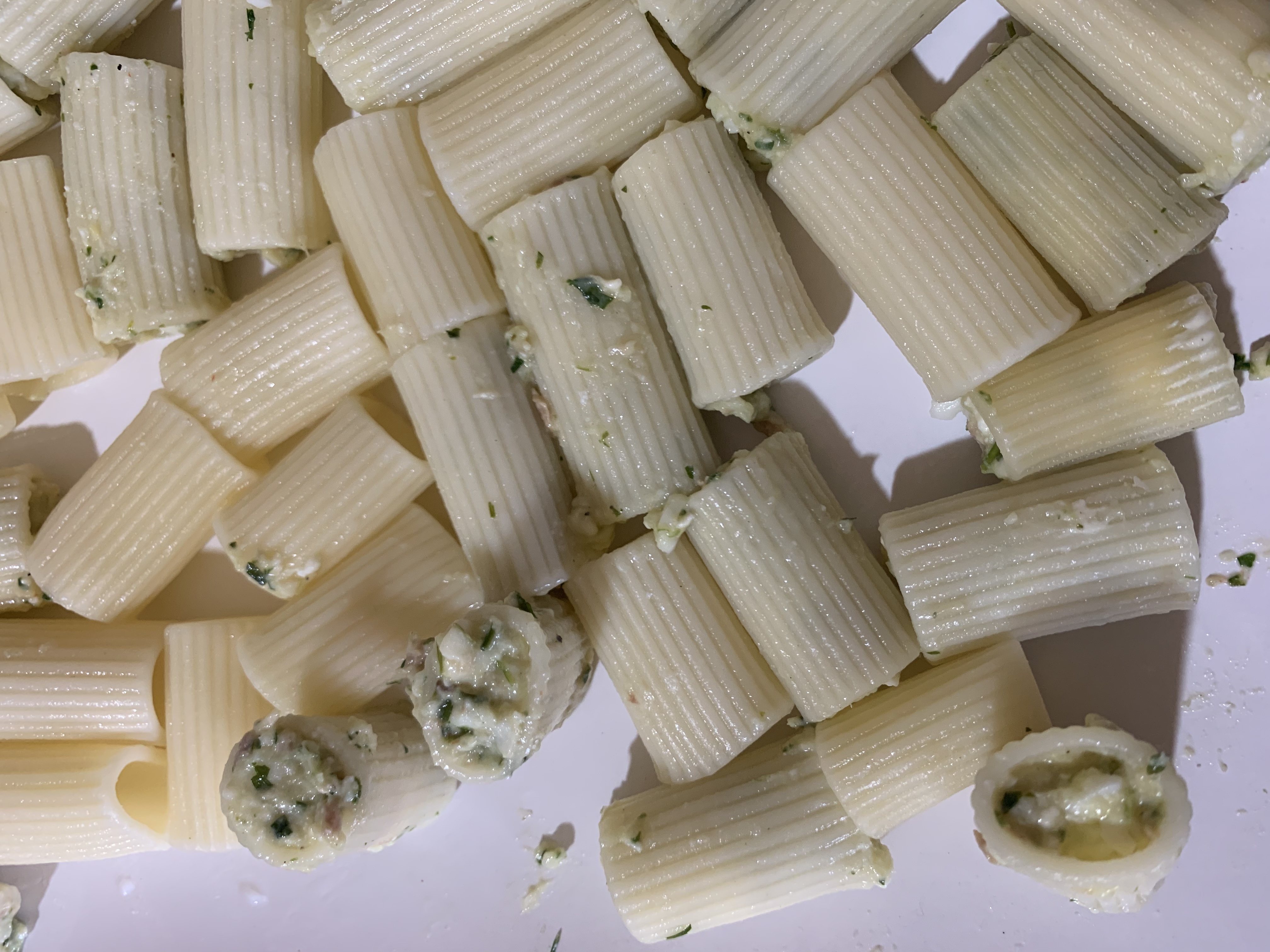 - Égouttez les rigattoni de l'eau et remplissez-les avec la farce :