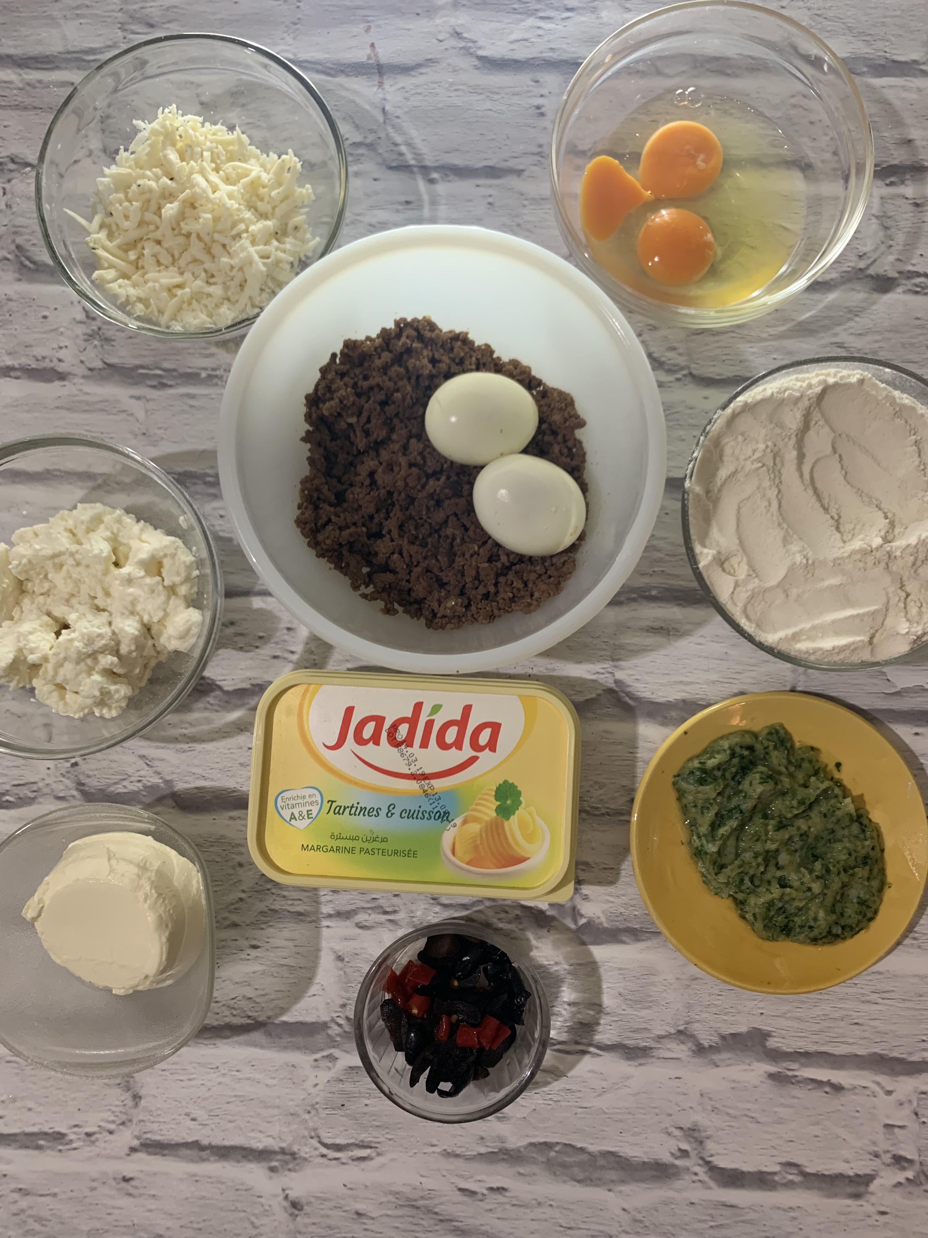 Faites chauffez l’huile dans une poêle Faites-y revenir la viande et l’ail Salez, poivrez et mettre les épices Laissez cuire 3 minutes à feu doux Ajoutez hors du feu les œufs cuit rappés la ricotta Felfel Bar Abid les olives et le fromage et enfin les œufs crus et un peut du mixe oignon et persil .