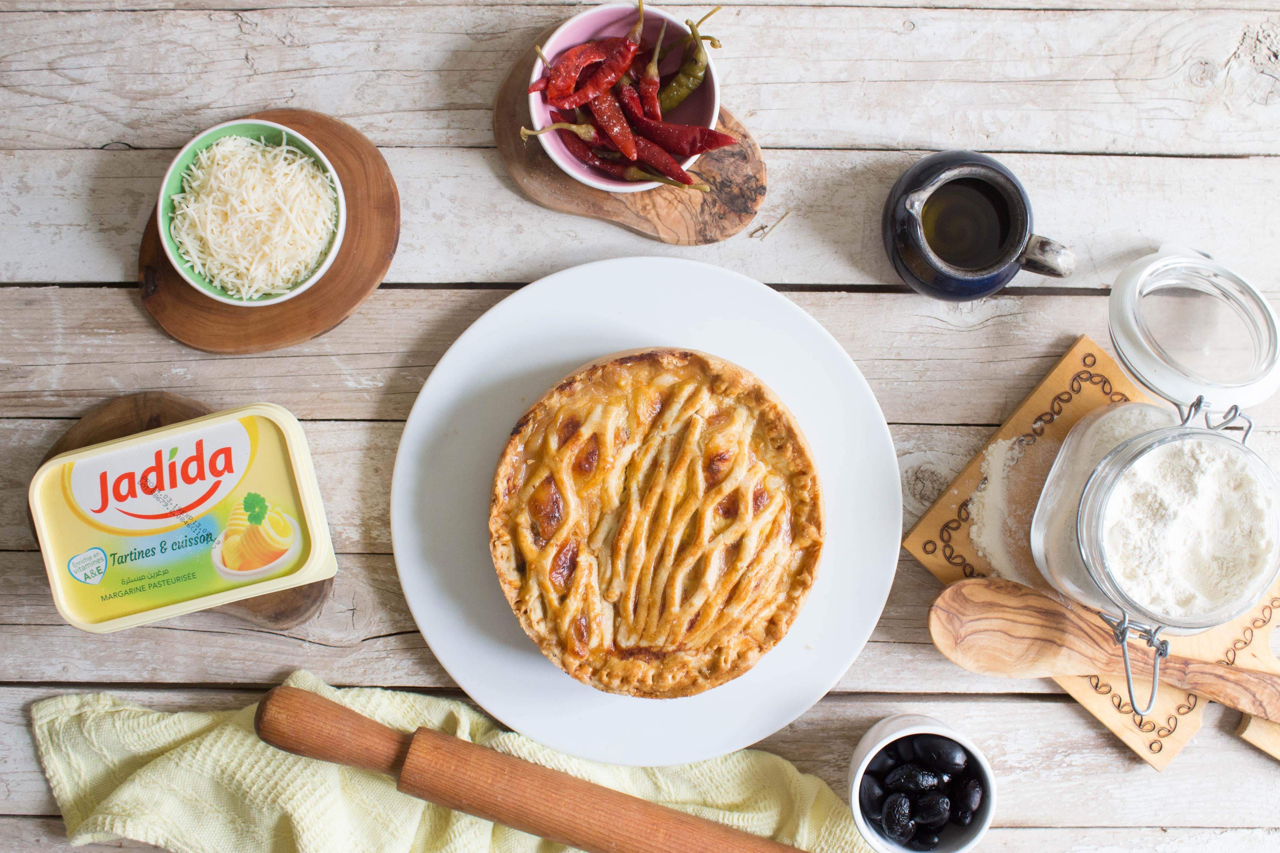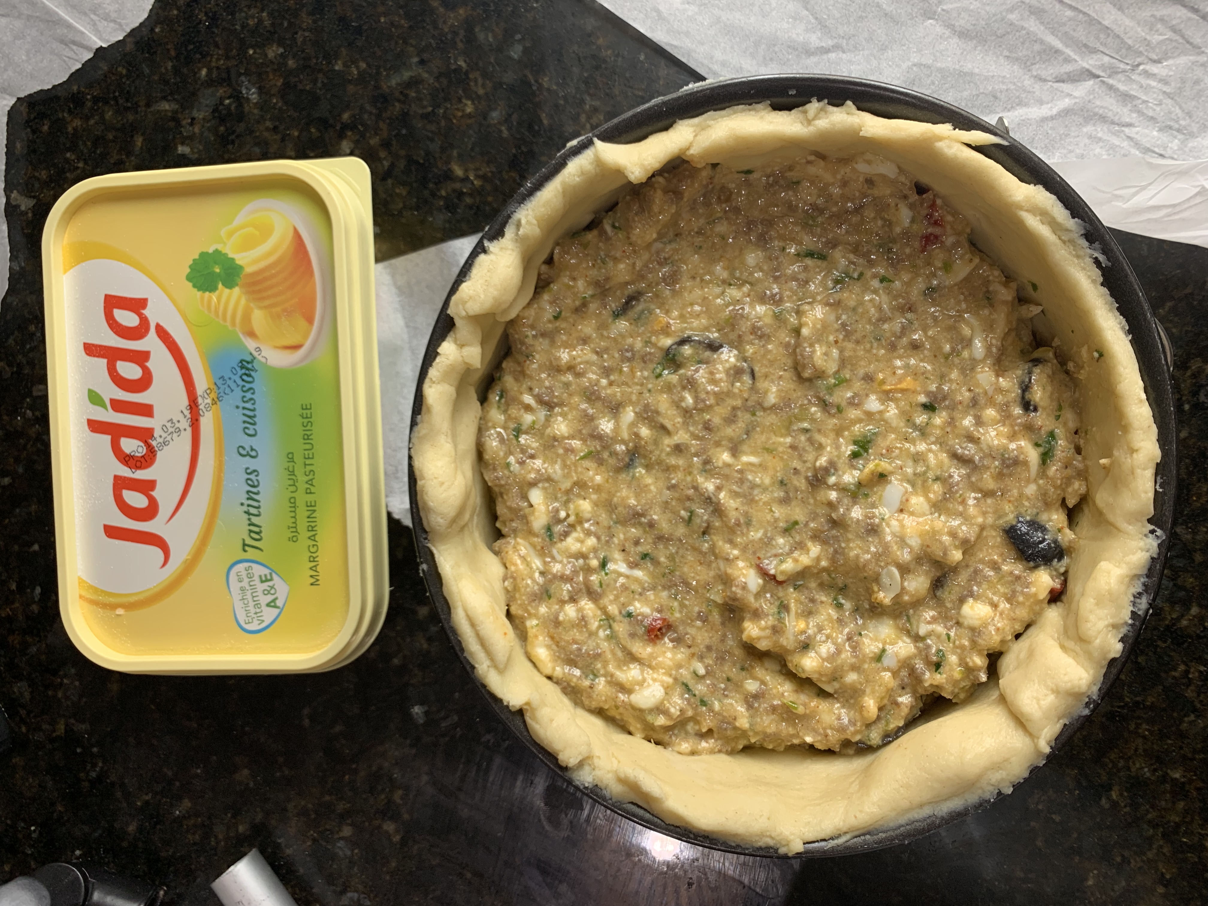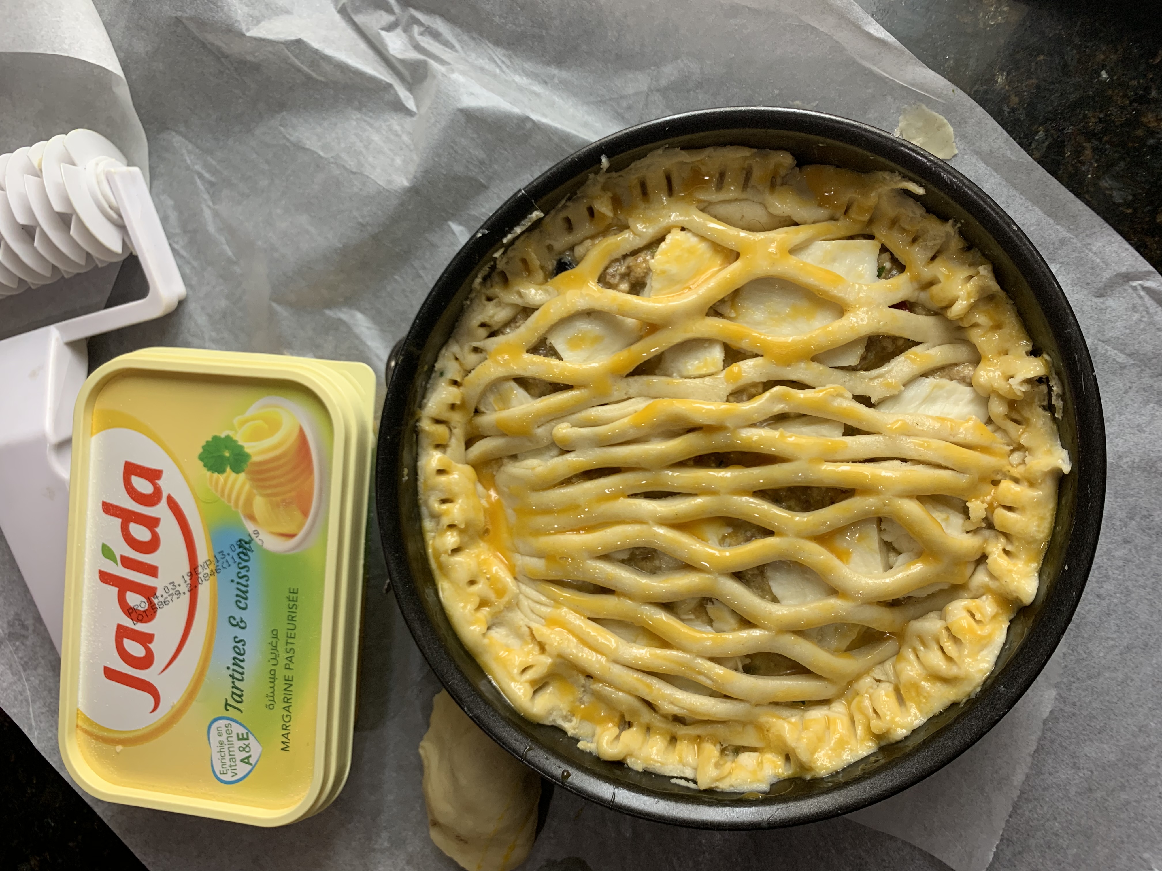 Prenez votre moule, étalez la moitié de la pâte et couvrez avec votre plat, laissez sortir des bords ; versez votre mélange et puis étalez la seconde pâte, refermez les bords et faites des petits dessins