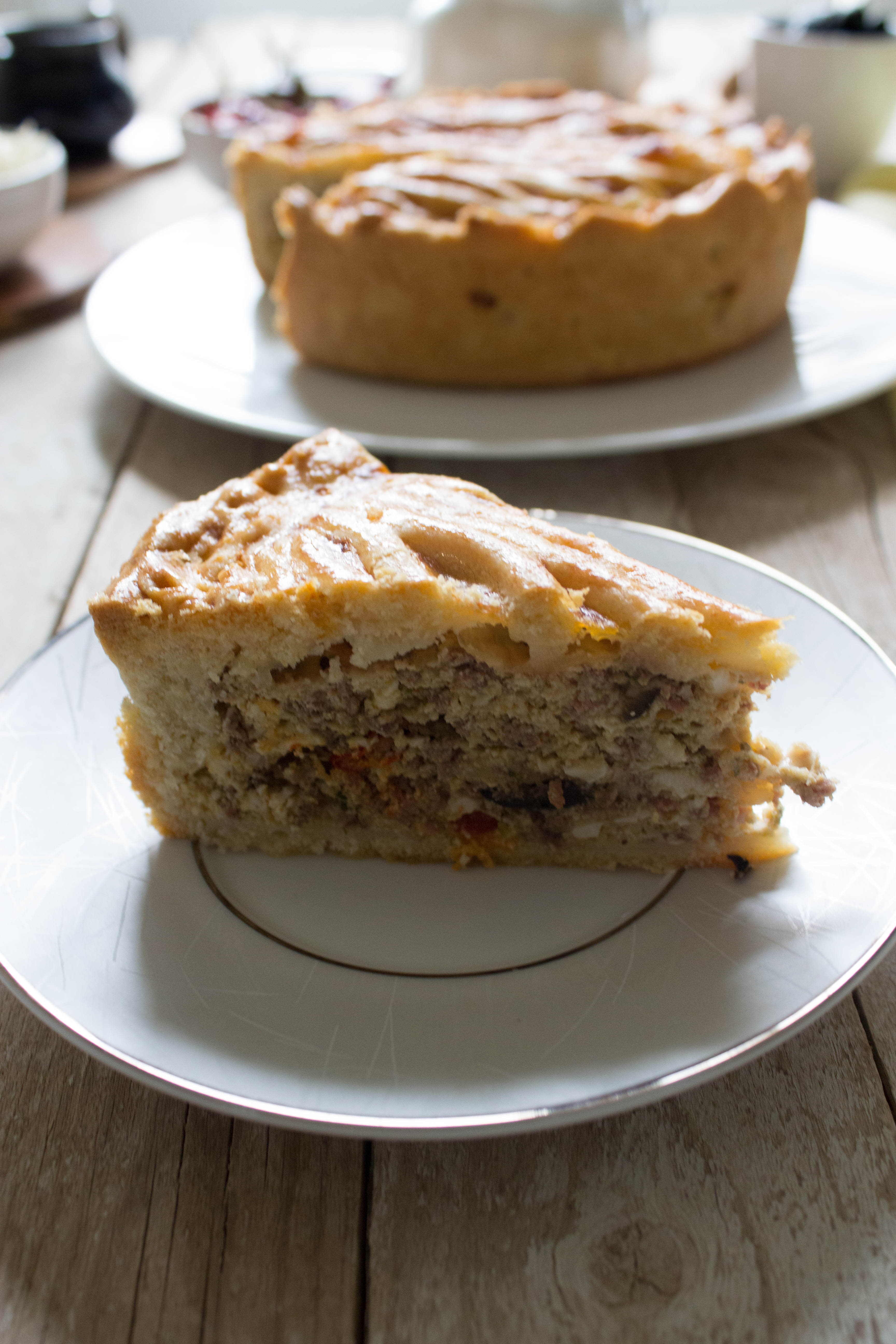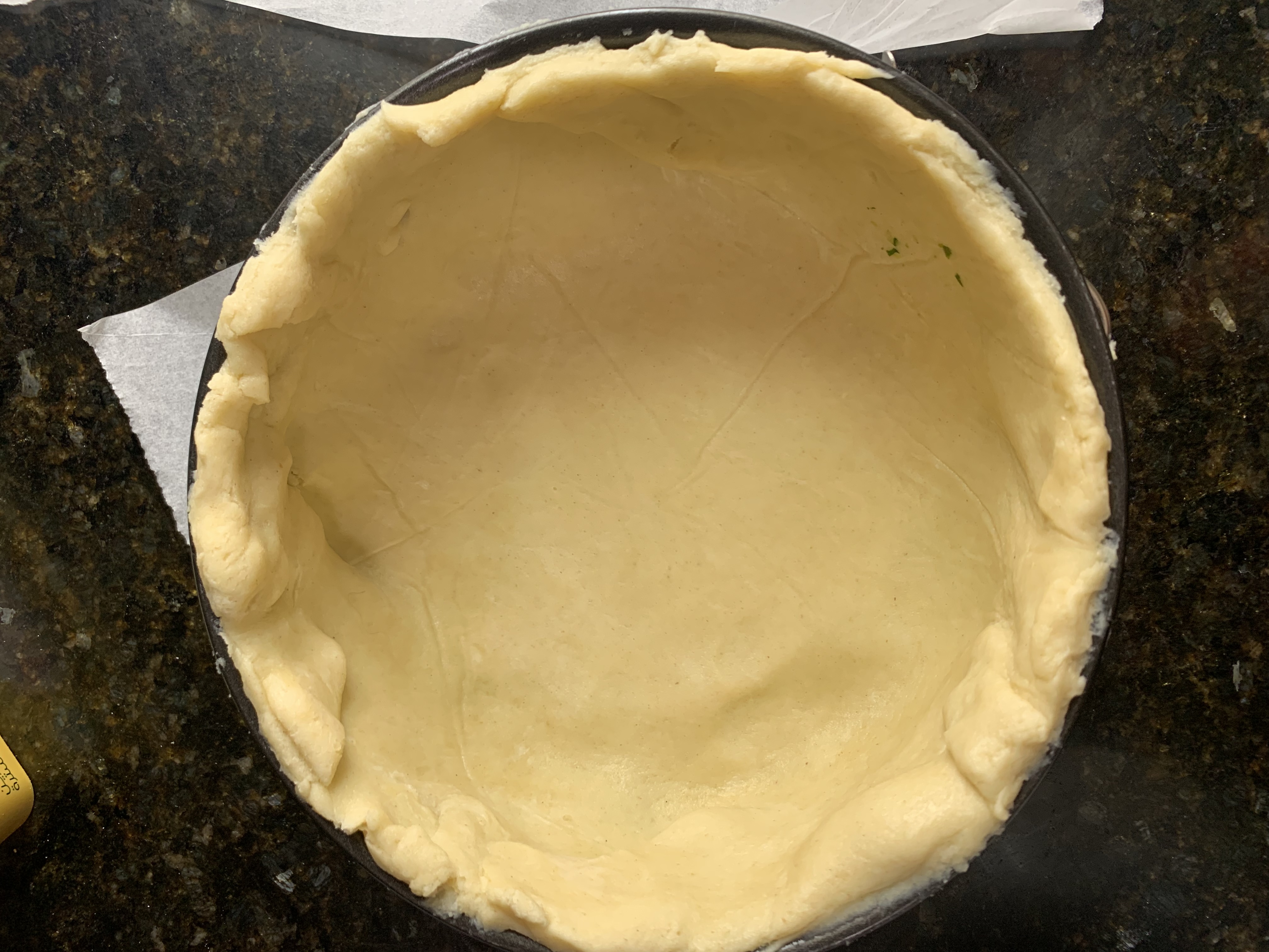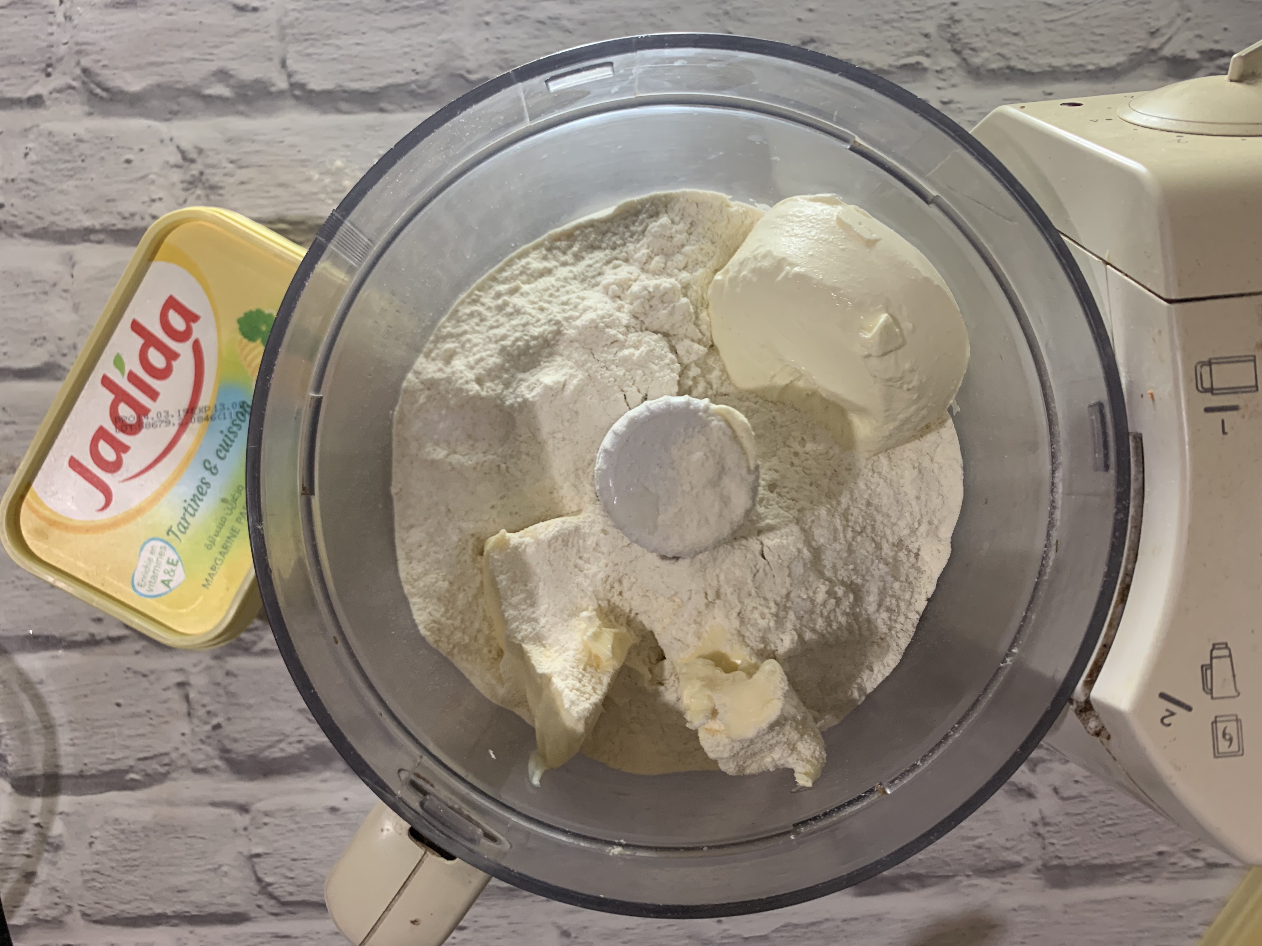 Prenez votre moule, étalez la moitié de la pâte et couvrez avec votre plat, laissez sortir des bords ; versez votre mélange et puis étalez la seconde pâte, refermez les bords et faites des petits dessins