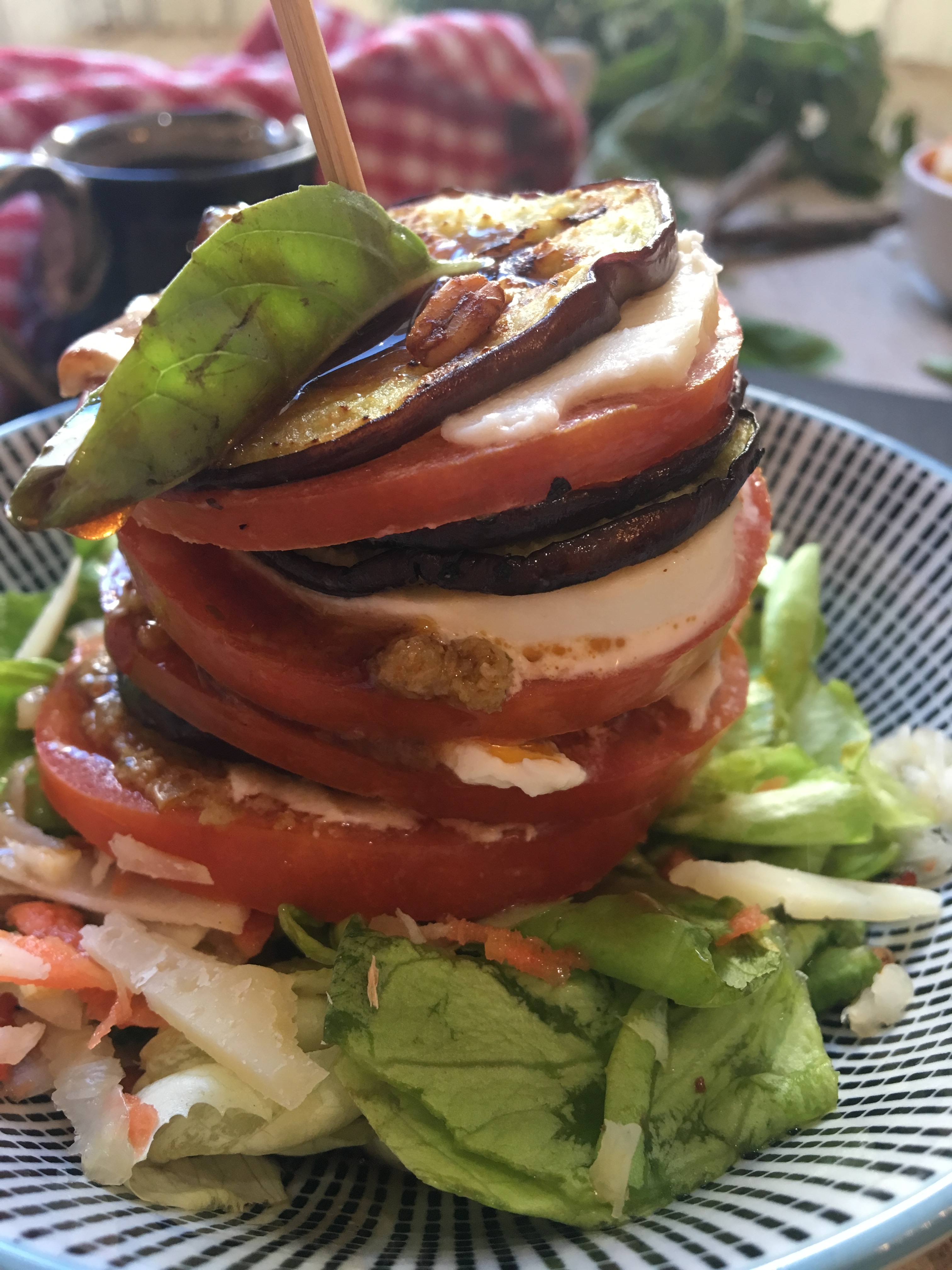 Dressez le mille feuille sur les assiettes en alternant les couches d'aubergines, de tomates et de mozzarella pâte d'olive vert jusqu'à épuisement des ingrédients