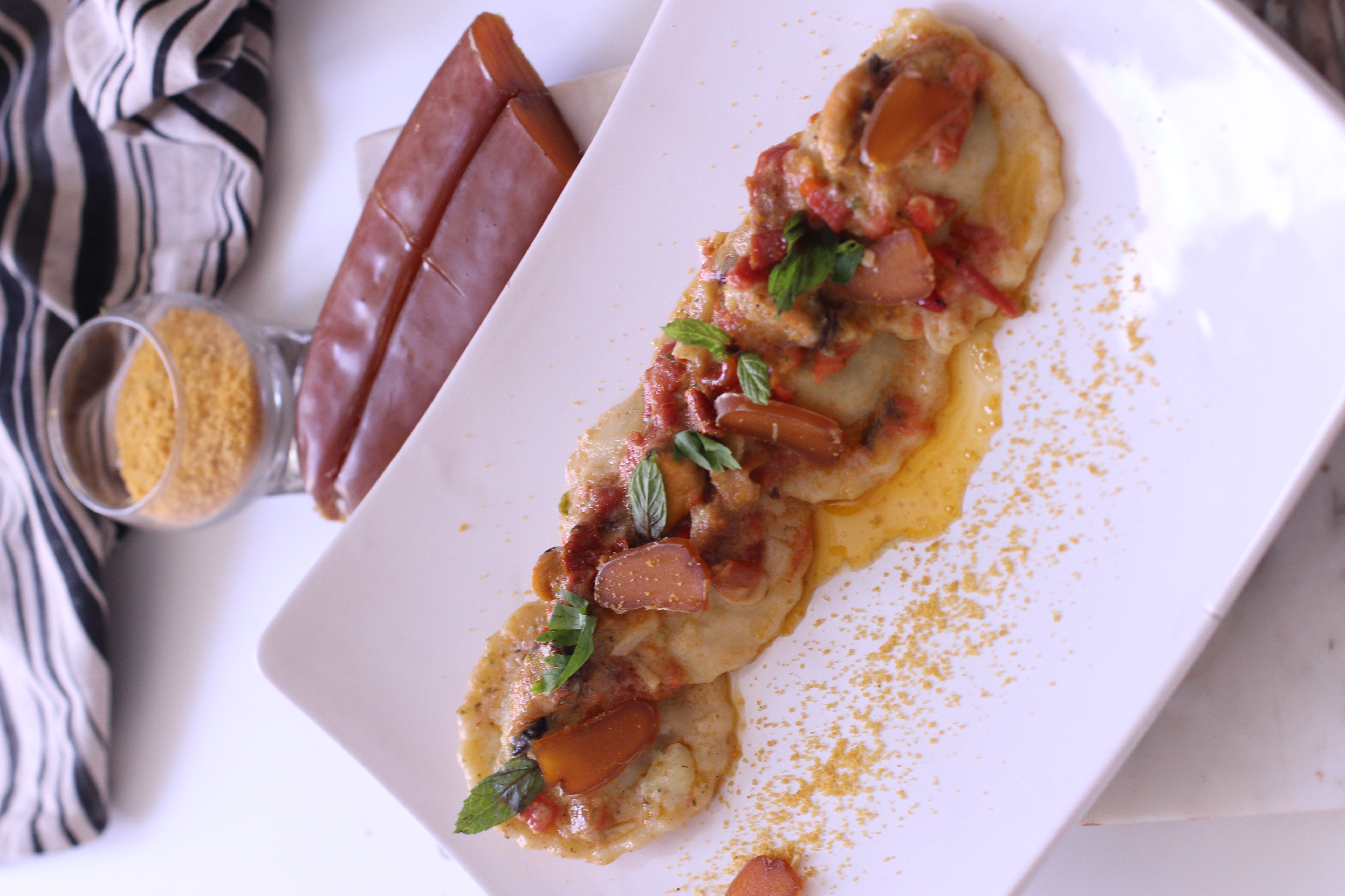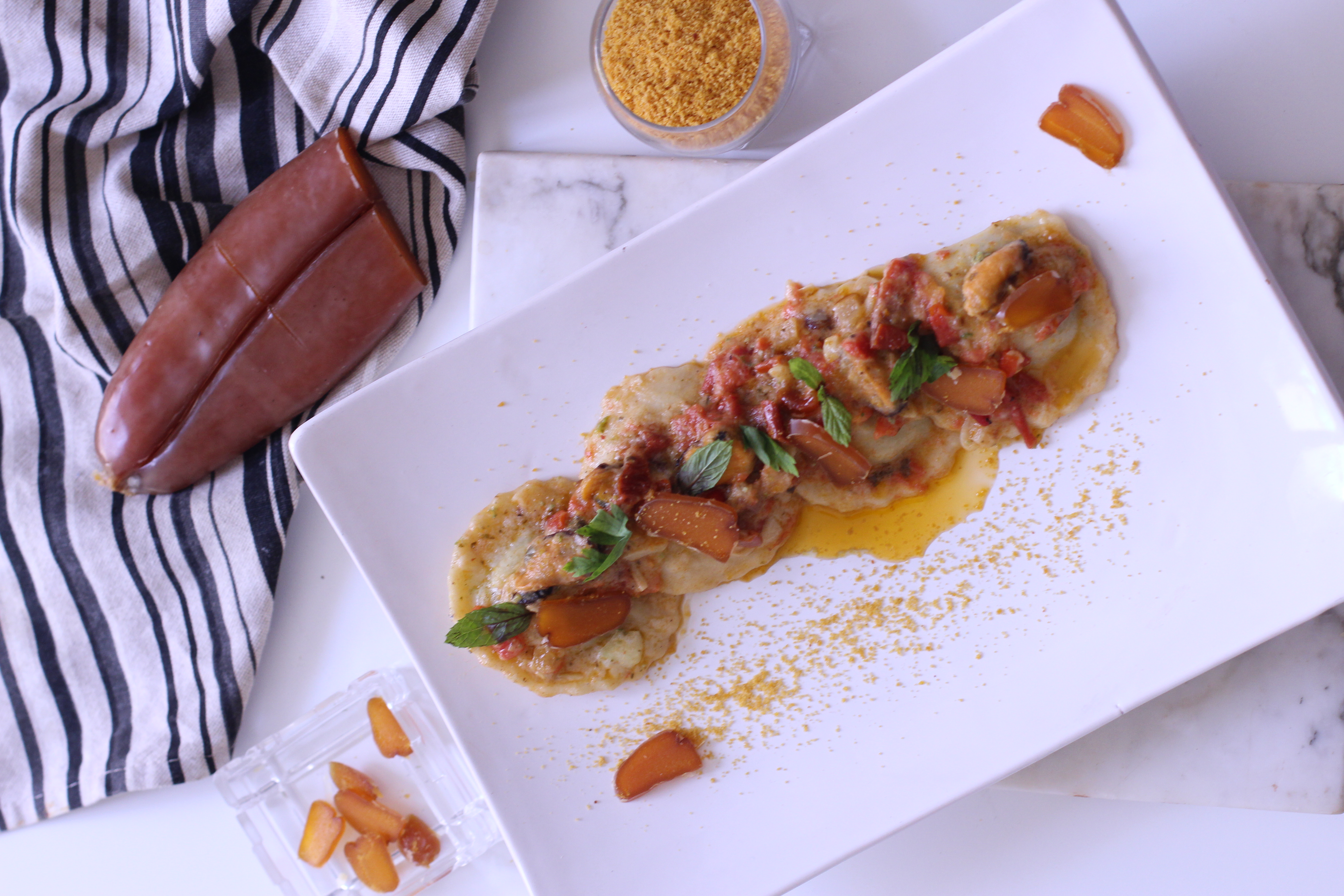 Dans une poêle, faites chauffer l’huile d’olive et faites-y blondir l’ail à feu très doux. le piment d'espelette l'extase de tomate (produit de délice du terroire tomate secheé parfumé au basilic )