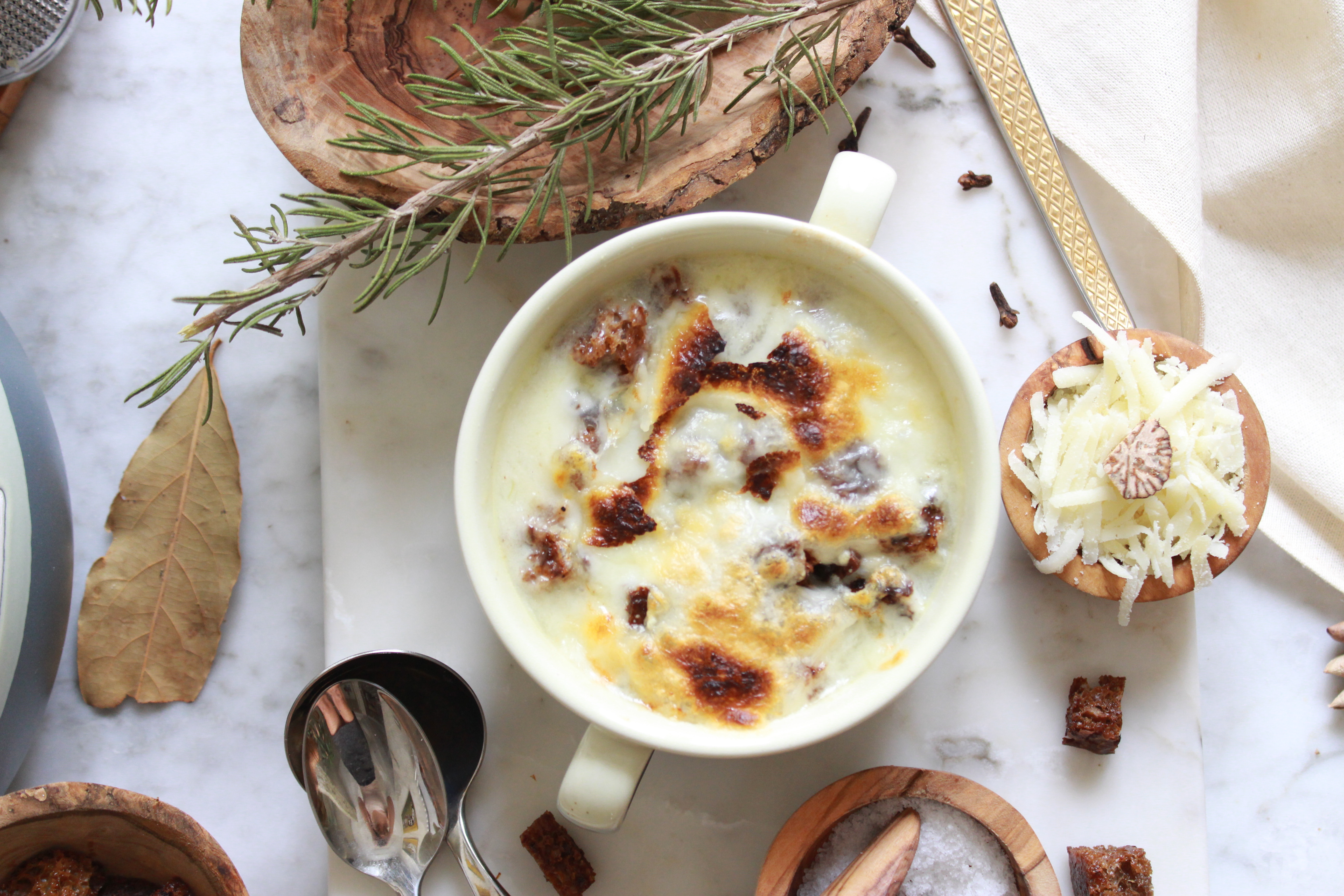 La soupe à l’oignon existerait depuis l’époque romaine. Elle a toujours été considérée comme « la soupe des pauvres », en raison de la facilité de cultiver les oignons, et de leur abondance. Sa paternité est attribuée à Louis XV : lors d’une partie de chasse, il se rend compte qu’il ne lui reste que des oignons, du beurre et du champagne. La première soupe à l’oignon serait née. Mais cette version est excellente .