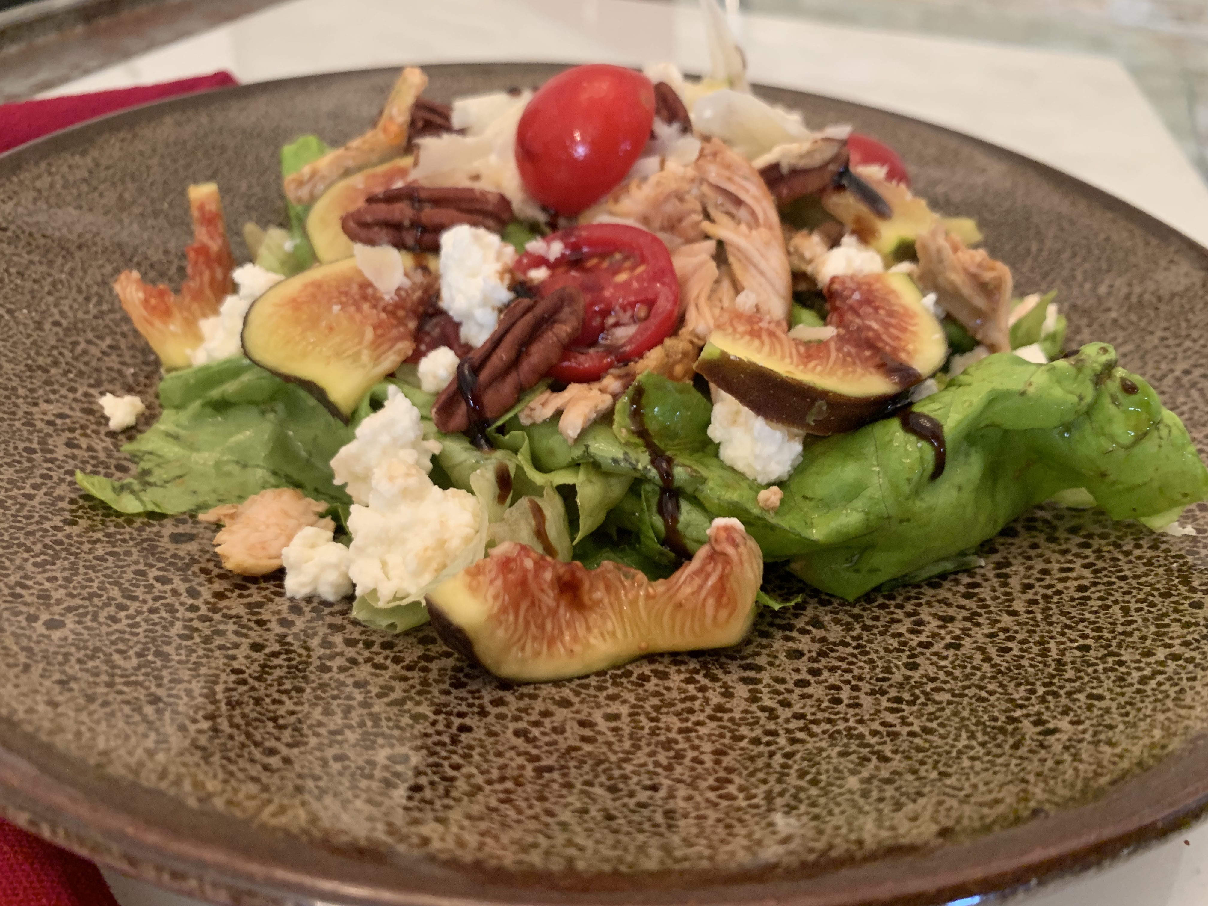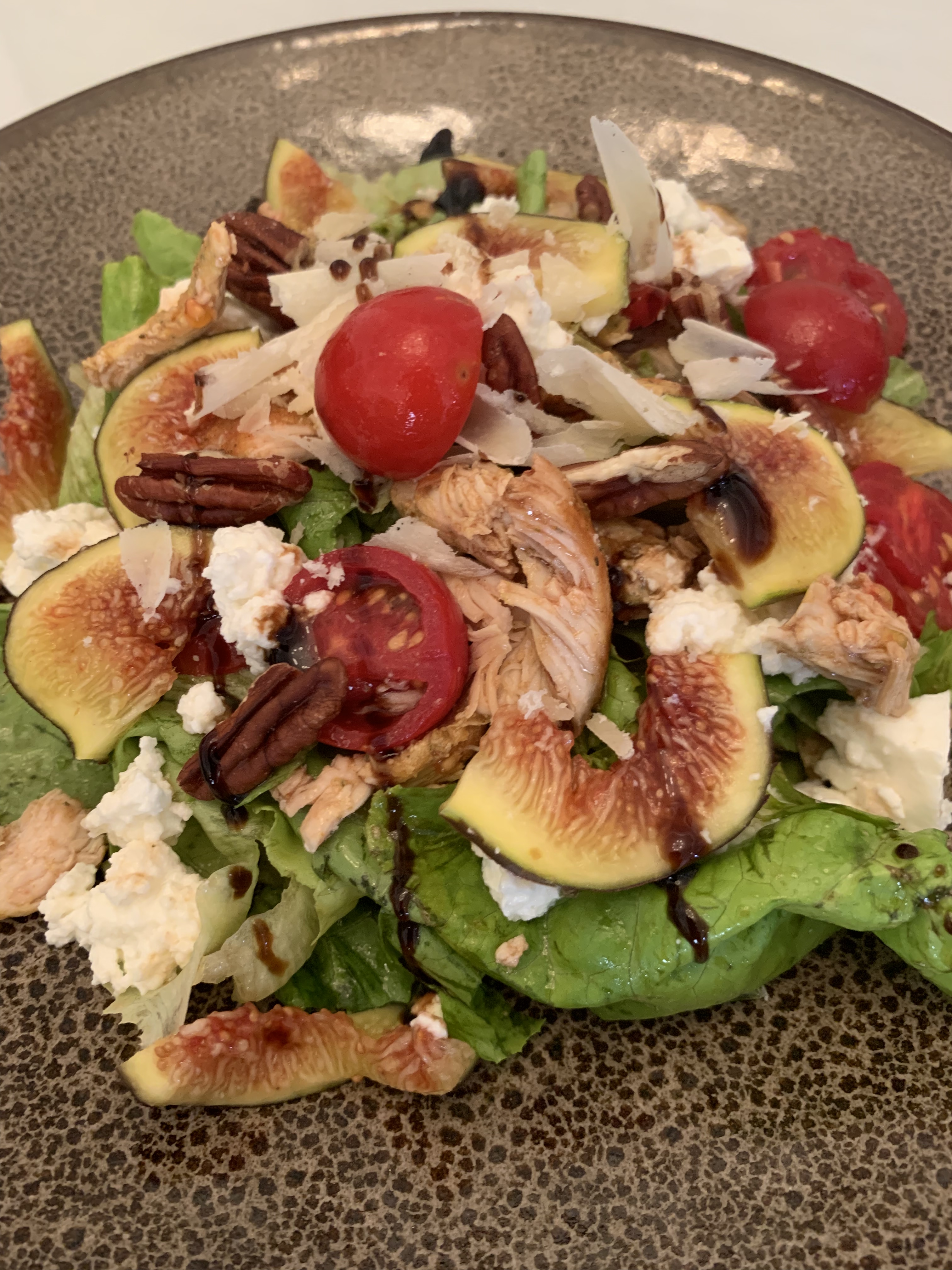 Coupez chaque figue en 8. Disposez la salade, arrosez avec la vinaigrette, posez ensuite de façon harmonieuse, les figues, l’escalope cru et les copeaux de parmesan. Dégustez