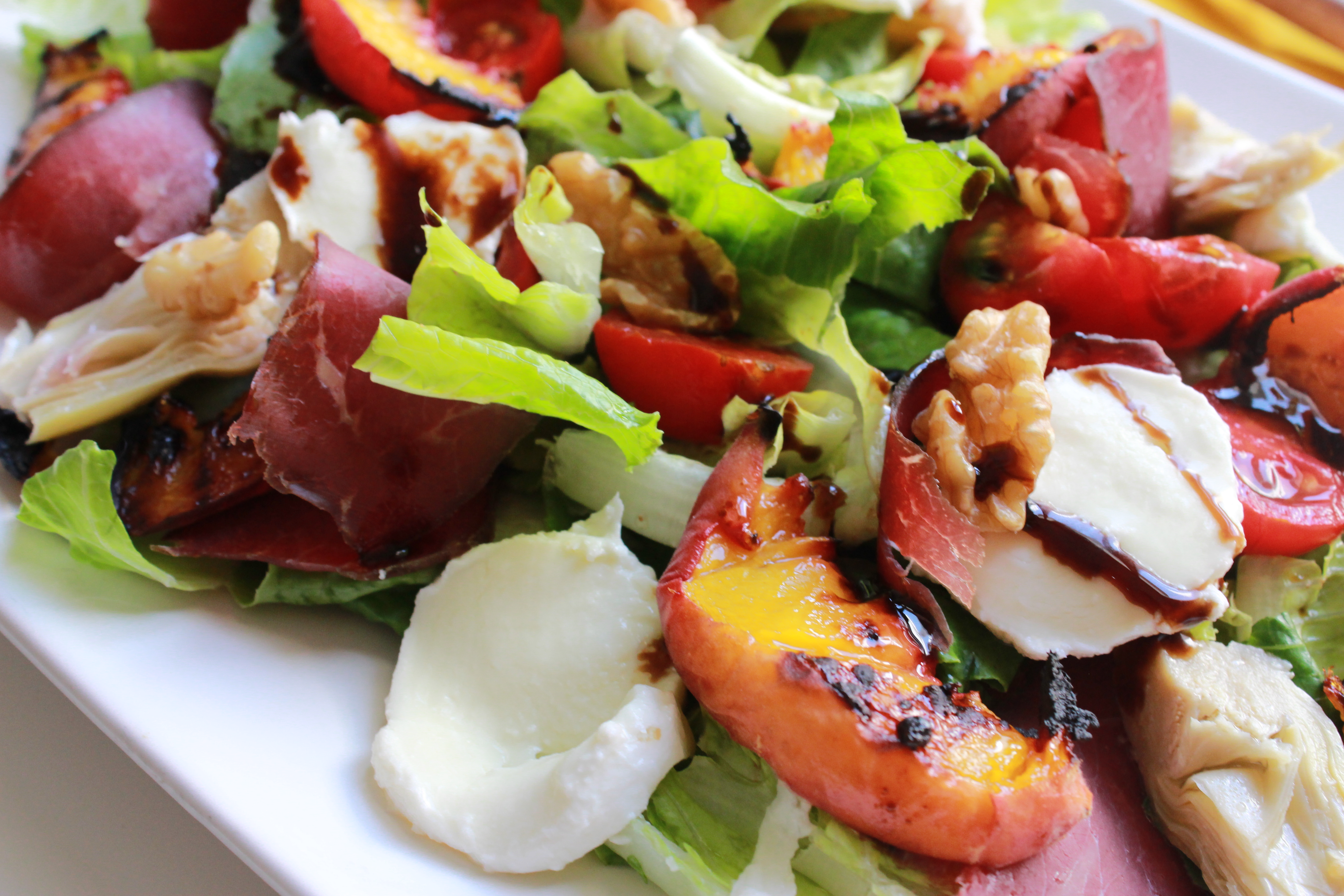 - Dans un grand bol, déposer la laitue, les noix et les pêches grille et le reste des ingrédient