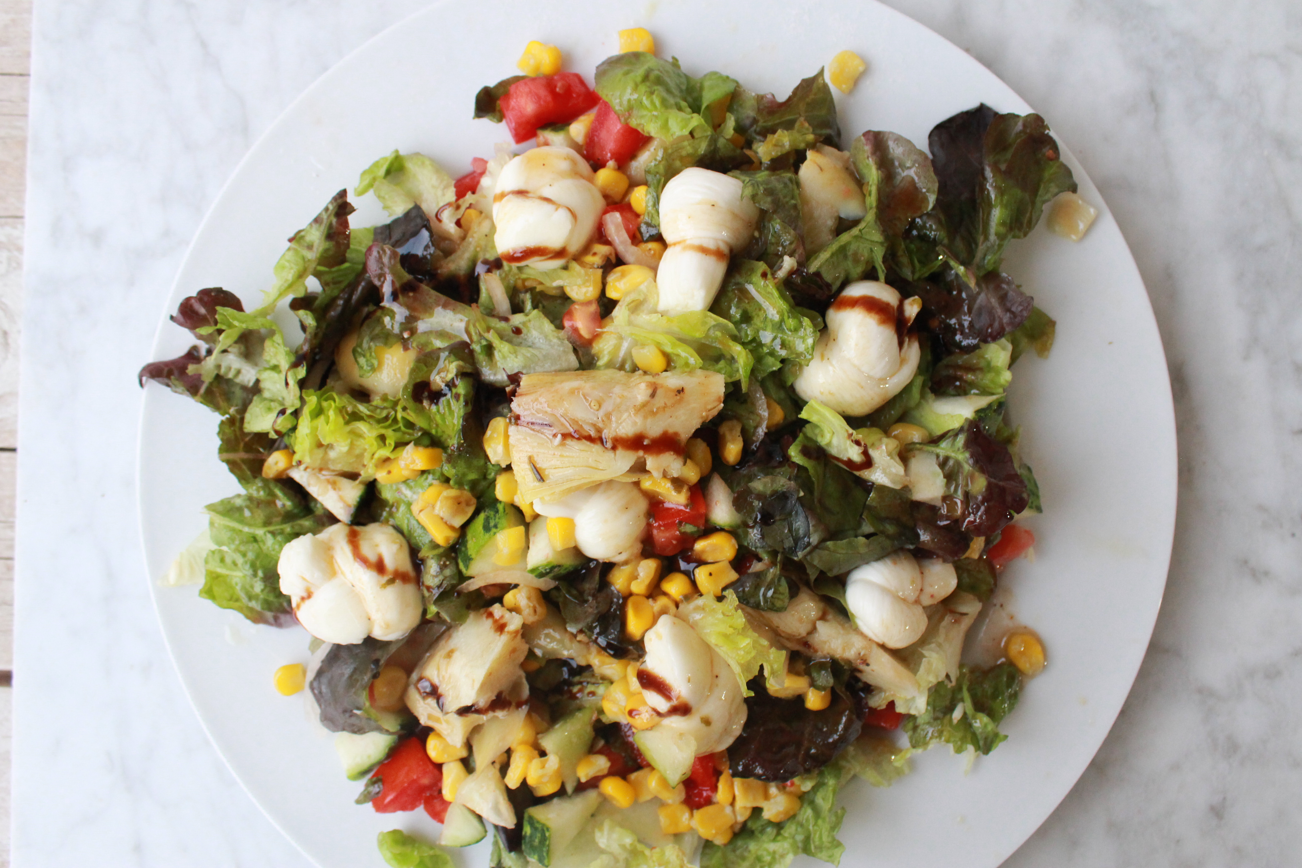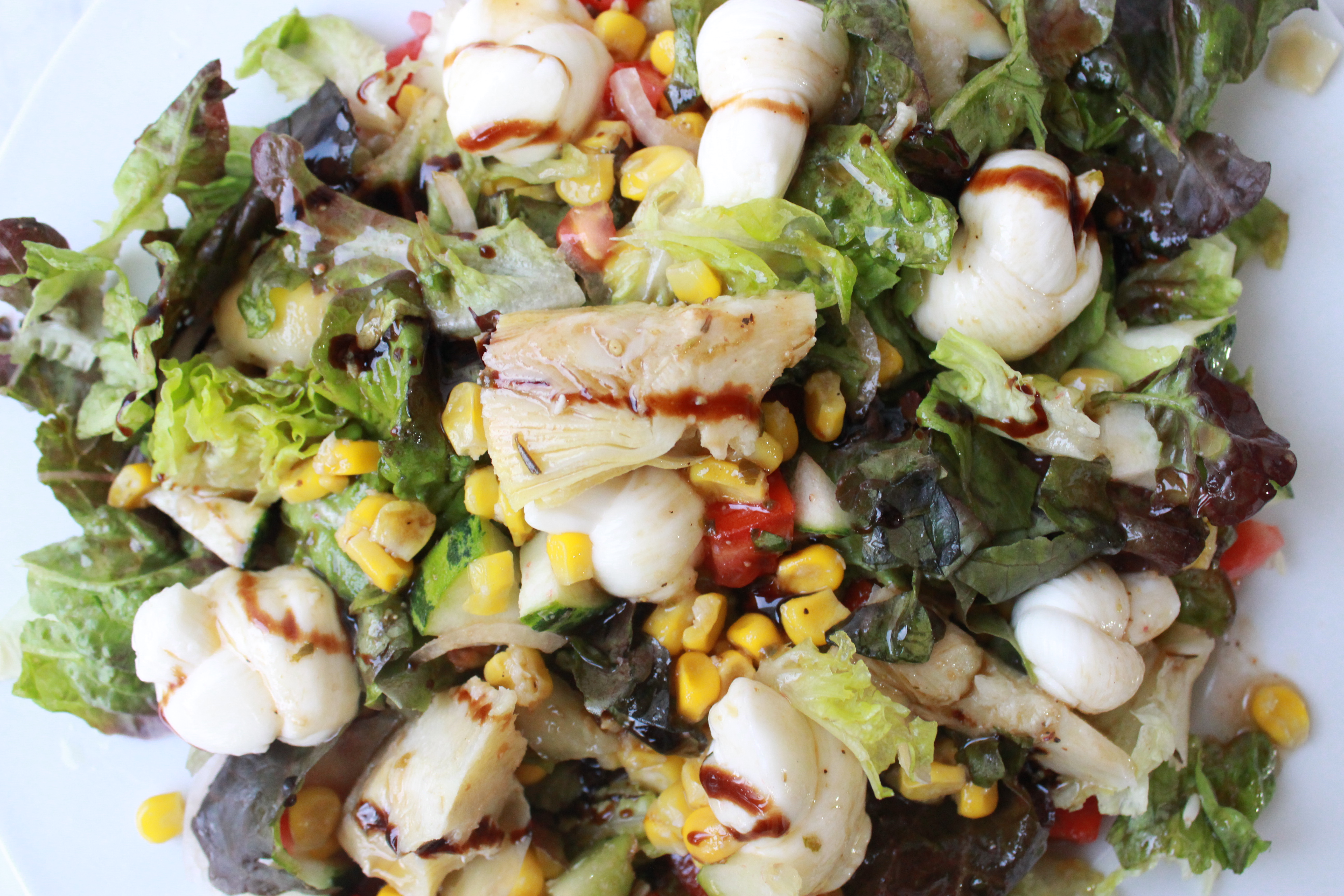 16 August 2020 Salade et soupe SALADE AU MAIS Twitter Laitue frisée Artichaud marineé Mais suer dans une poêle avec de l'huile,et ail saler et poivrer Mini mozzarella Tomate Concombre pistache et noix de cajou salé vinaigrette : huile citron et vinaigre balsamique sel Previous Next