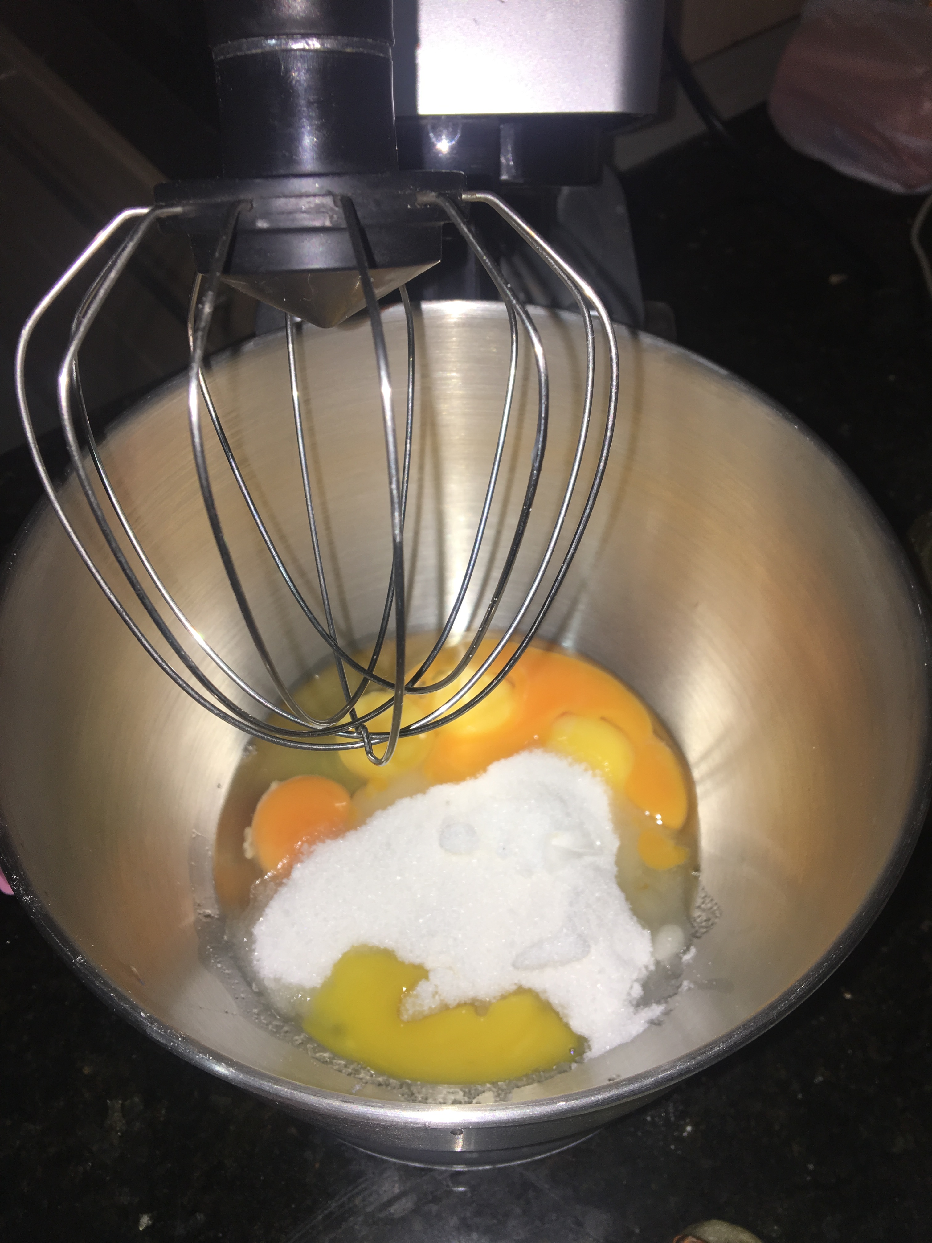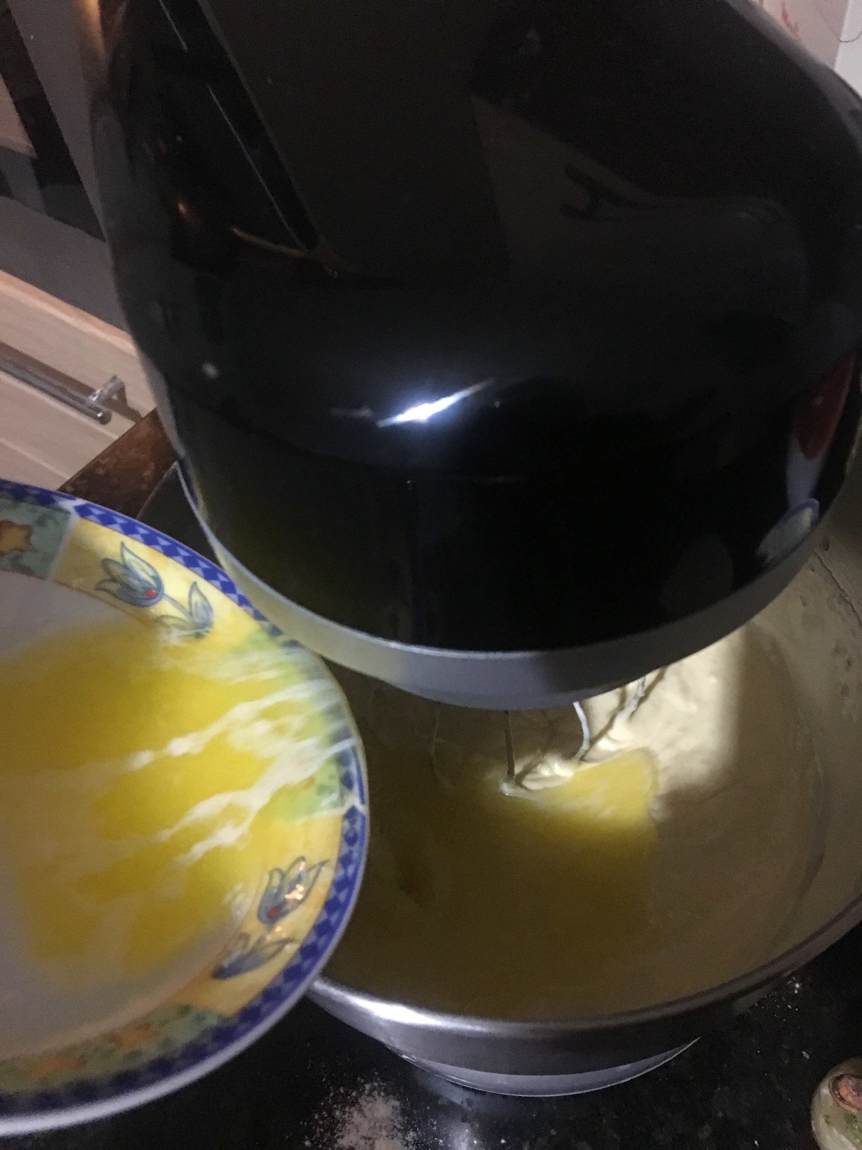 Mélangez les jaunes d'œuf et les oeufs avec le sucre semoule, ajoutez la crème. Ajoutez les poudres tamisées puis le beurre fondu. Séparez le mélange en 3.