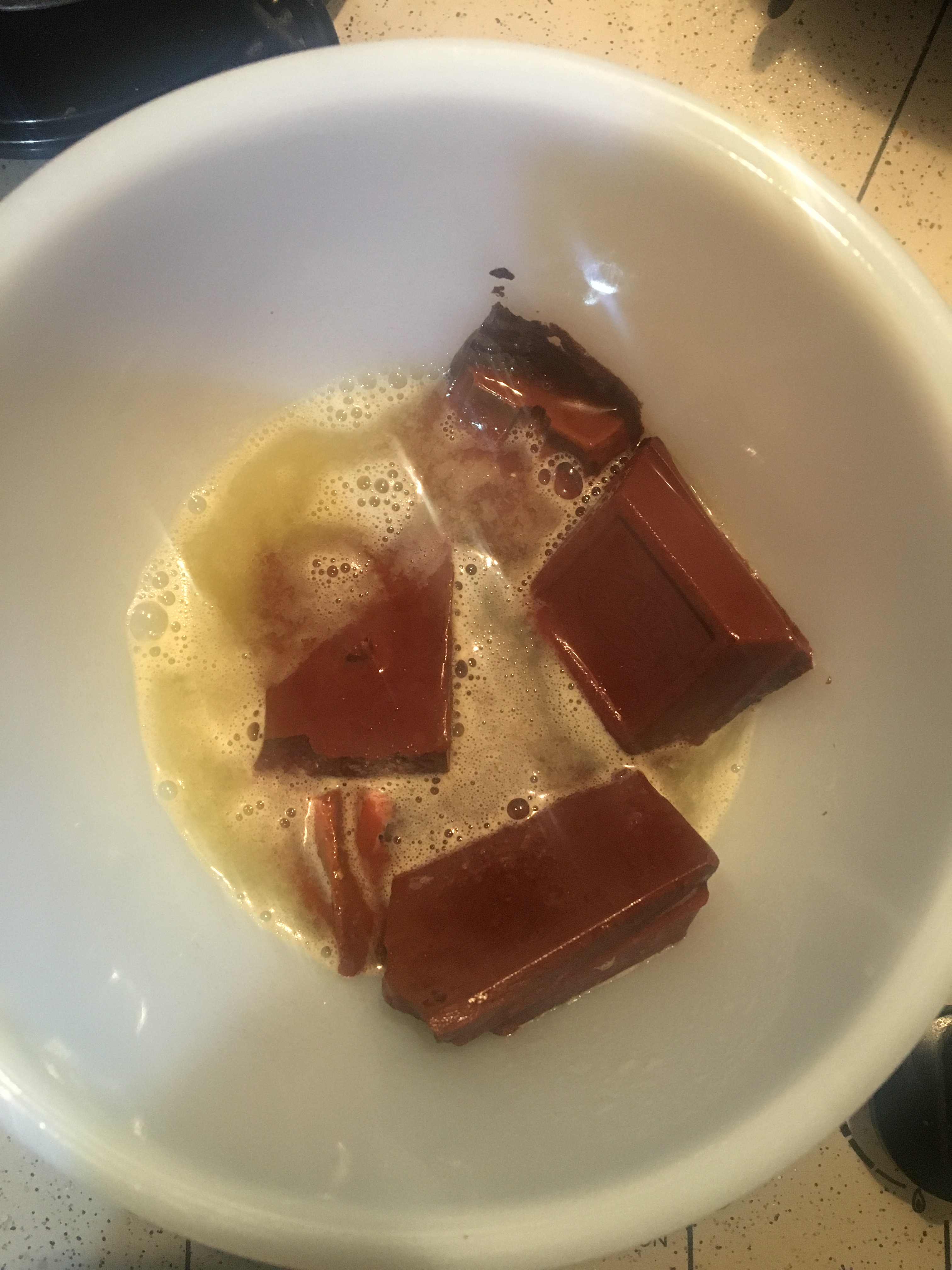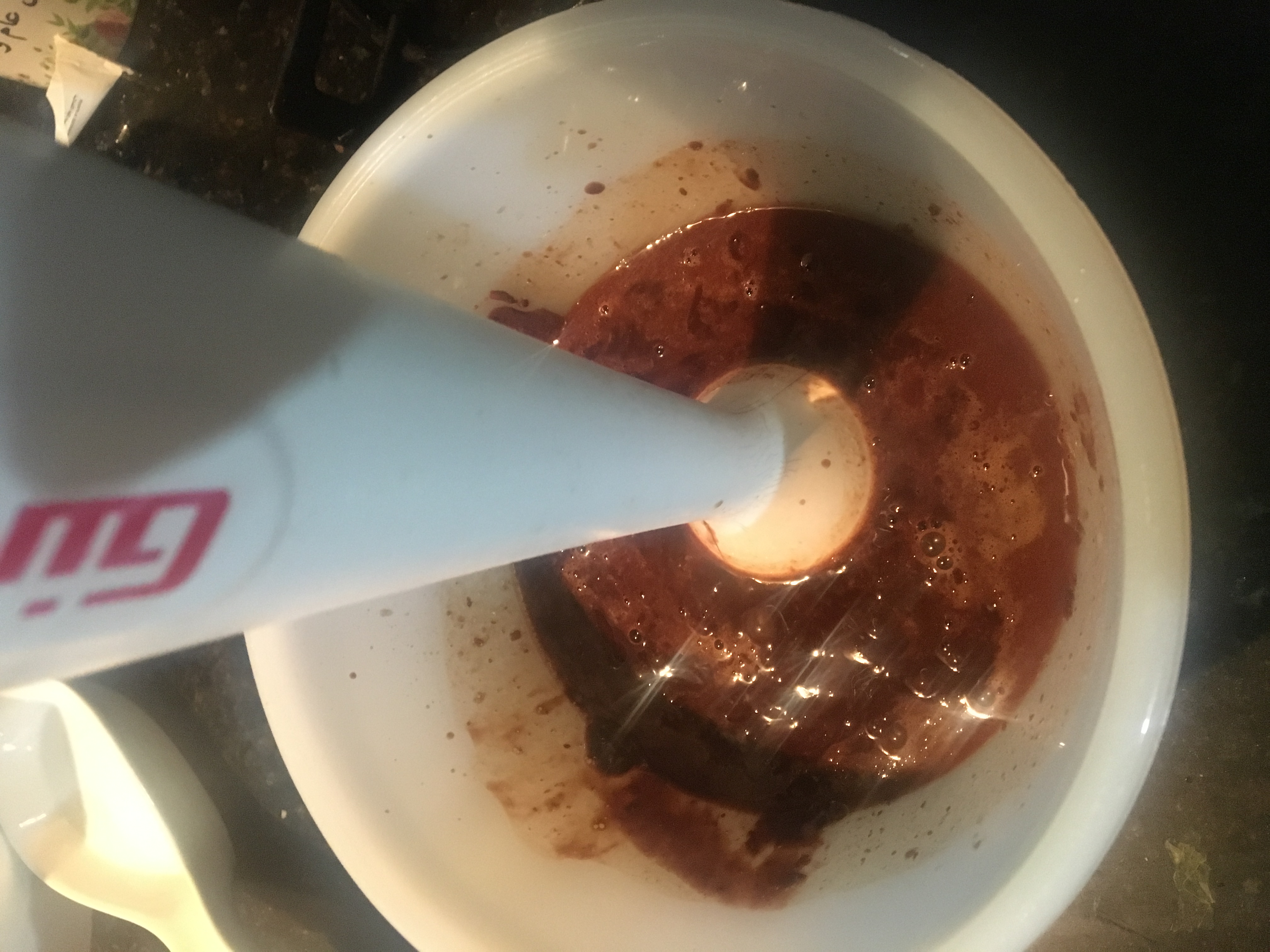 Versez le jus chaud sur le chocolat que je viens de réchauffé au bain marie