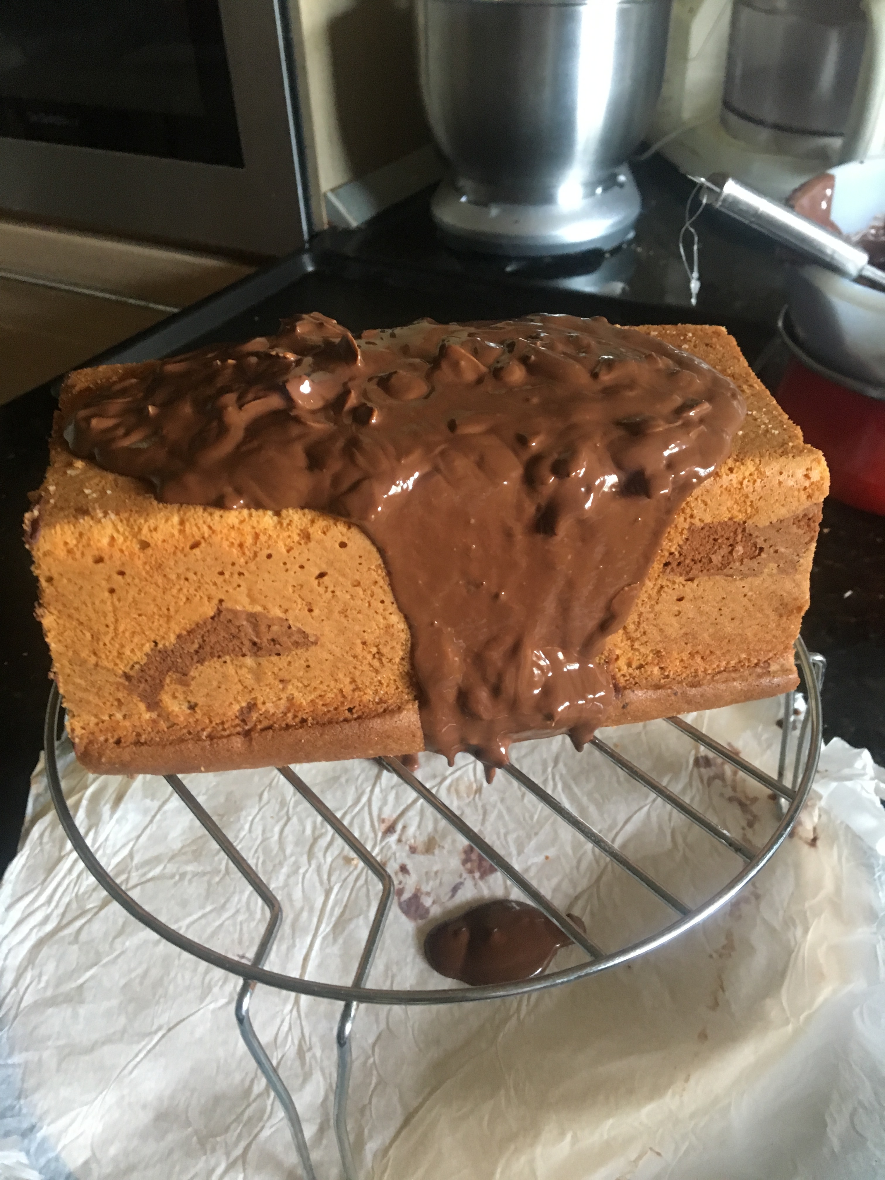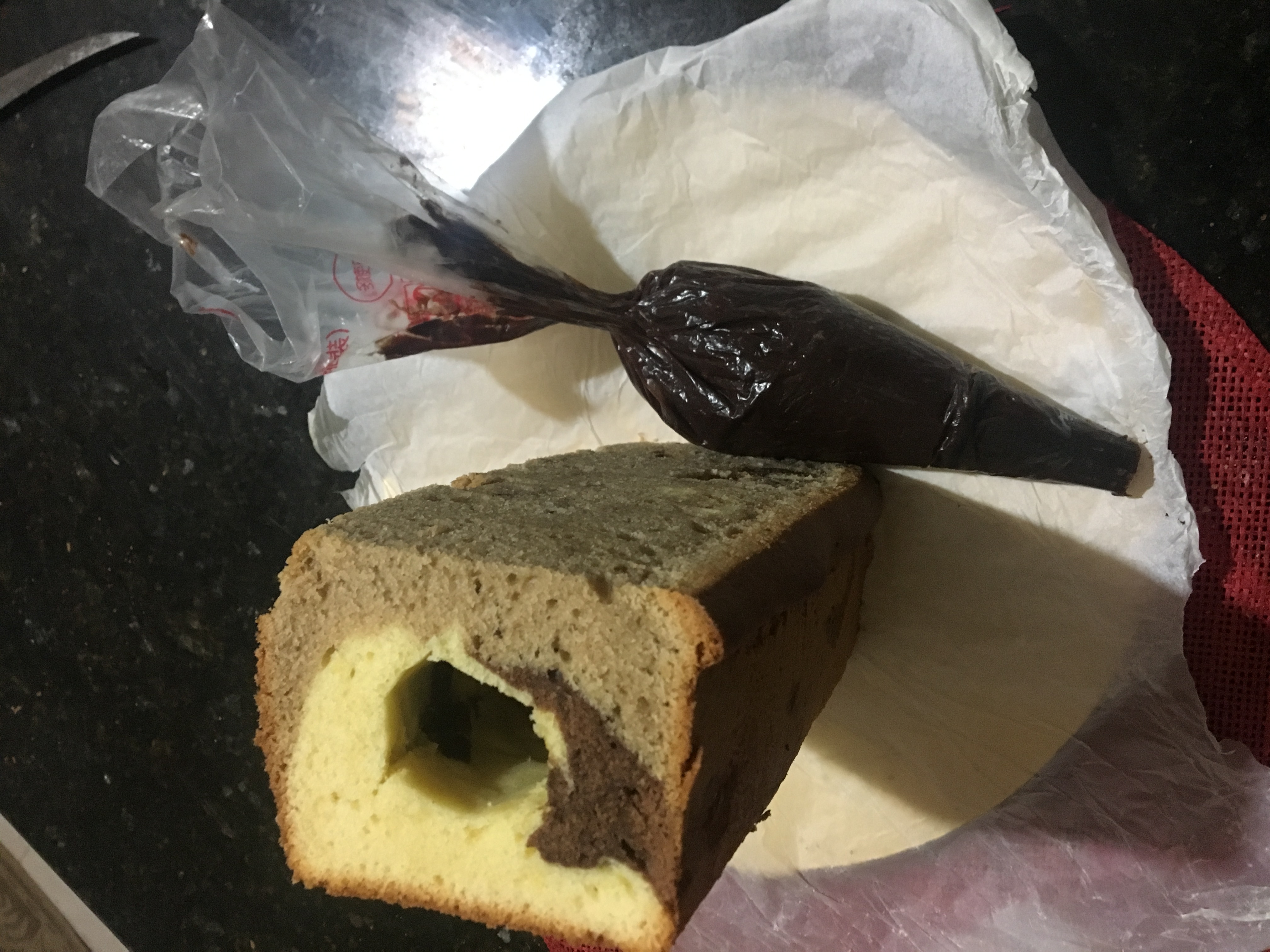 Je mets debout versez la ganache dans le trou. et retourner pour vous assurer que le gâteau est bien remplit