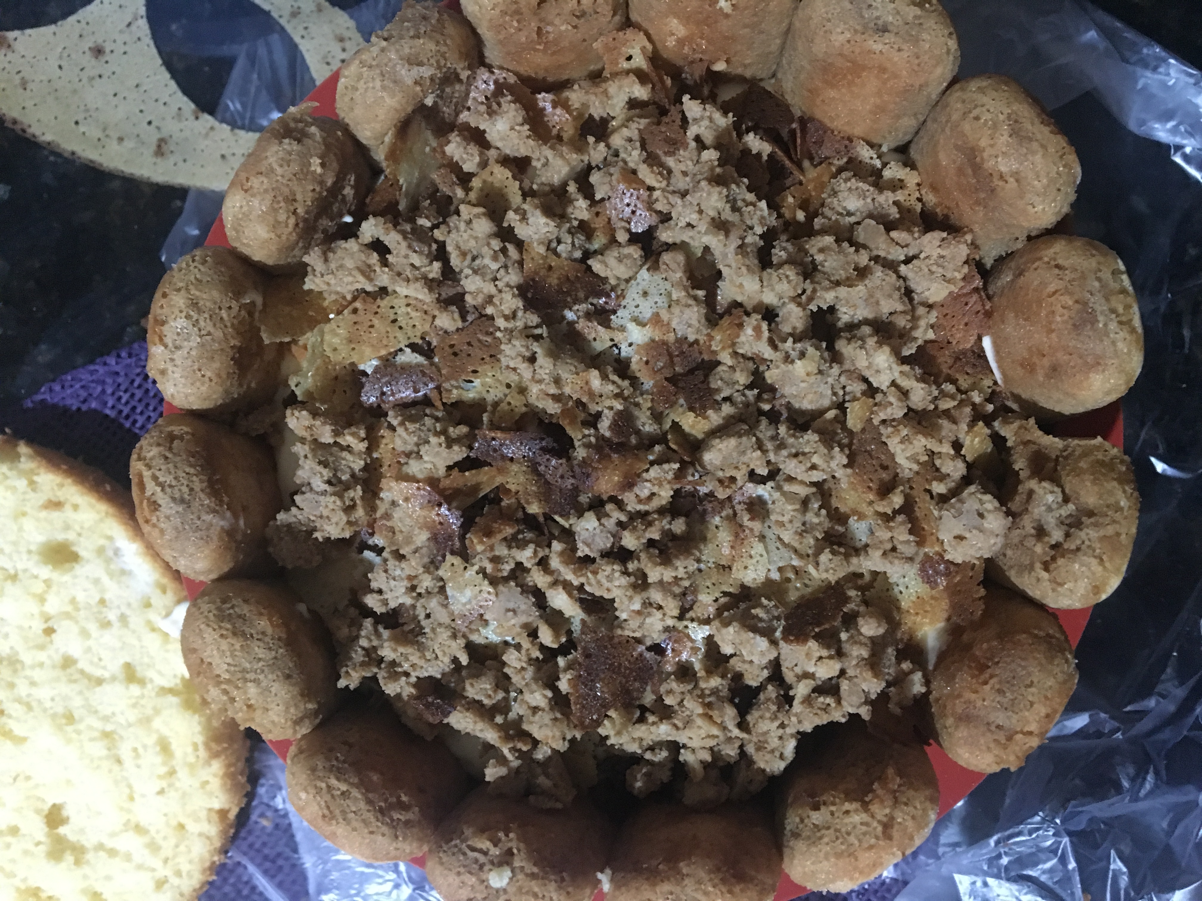 J’ai mis un peu de craquelins chocolat et feuilletine et j’ai fait un gâteaux éponge pour couvrir le tout