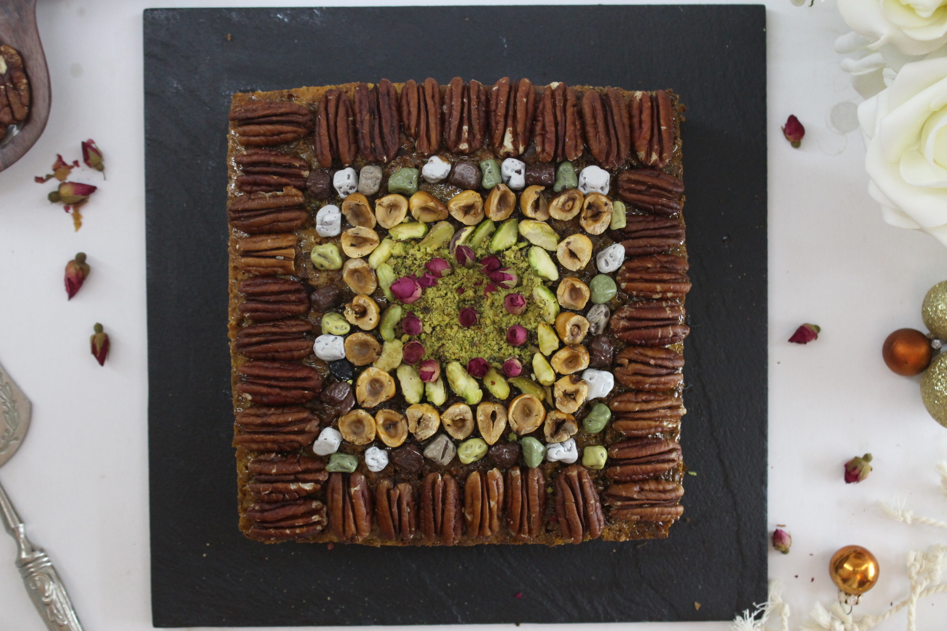 Décorez de suite avec des pistaches ou noisettes en poudre. N'attendez pas le refroidissement du gâteau sinon ça ne tiendrait pas