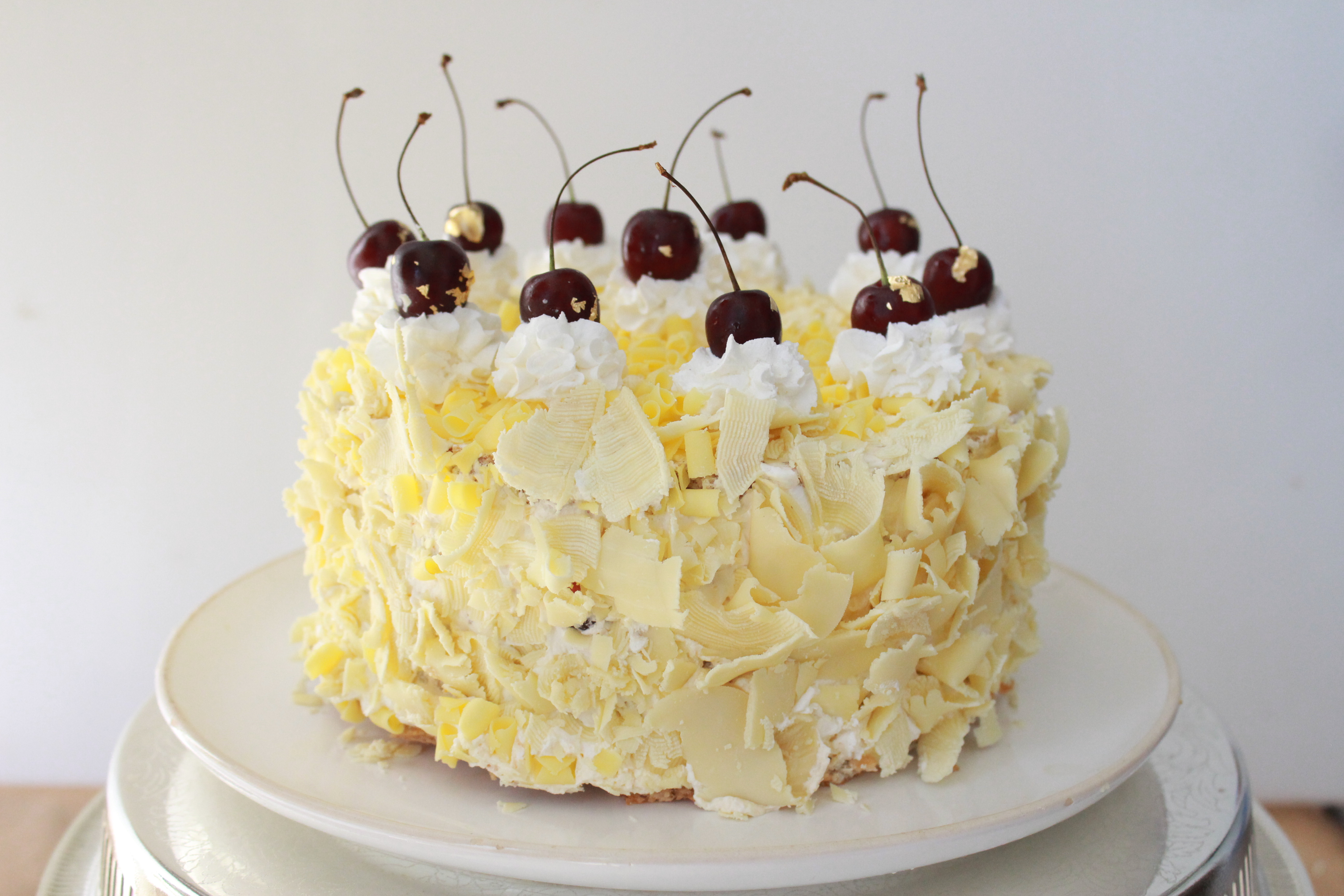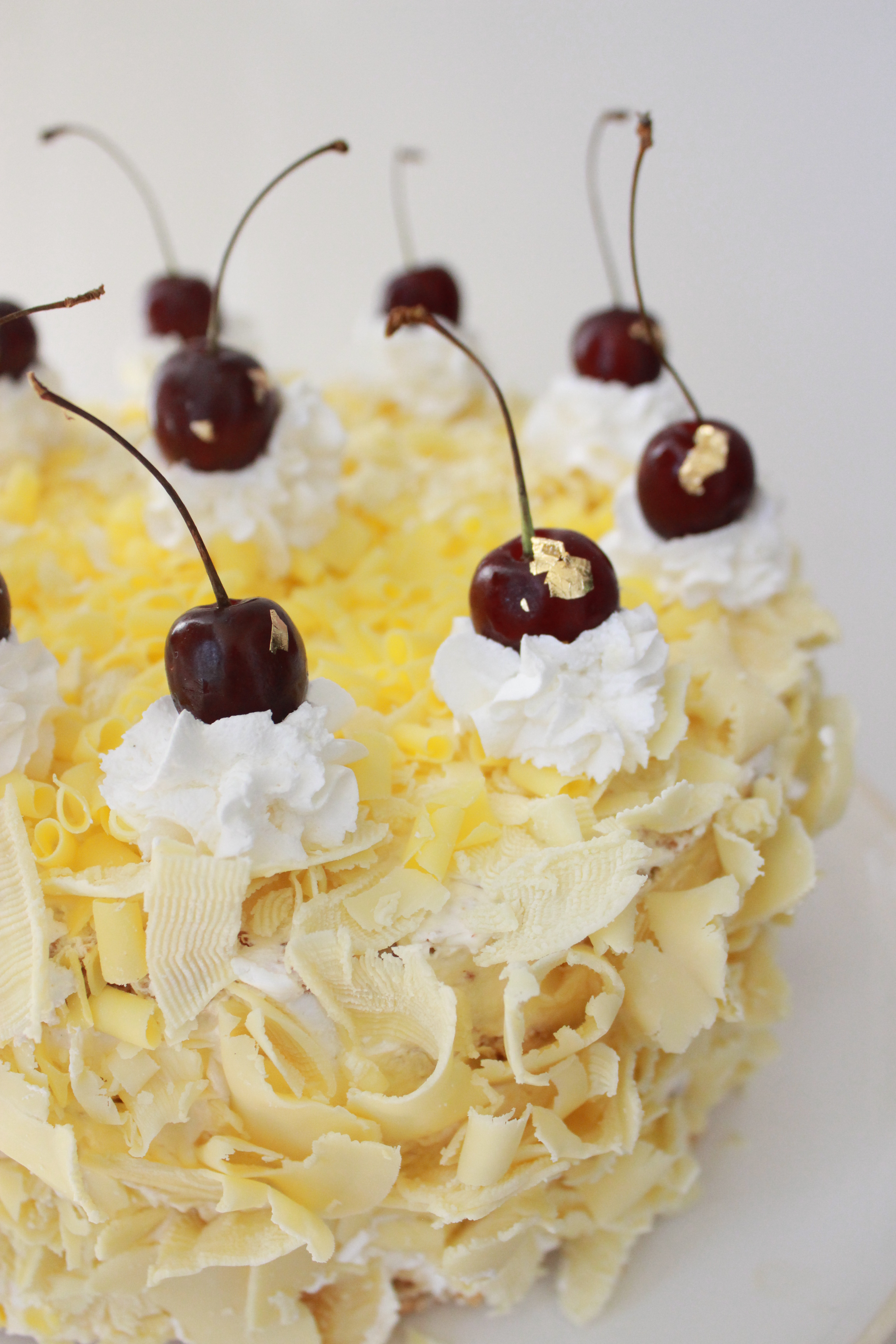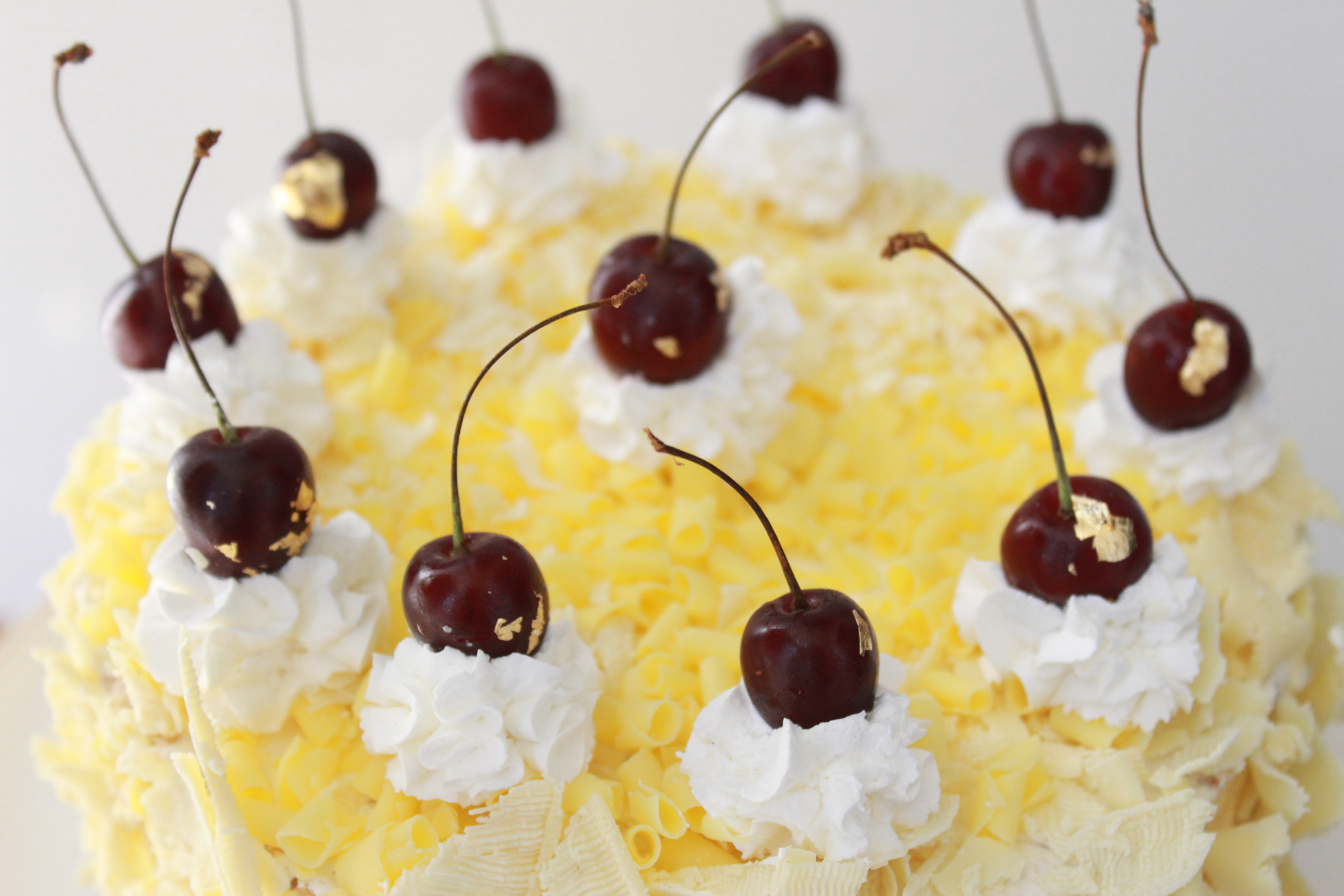 Décorer avec des copeaux de chocolat, blanc des rosaces de créme et des cerises confites.