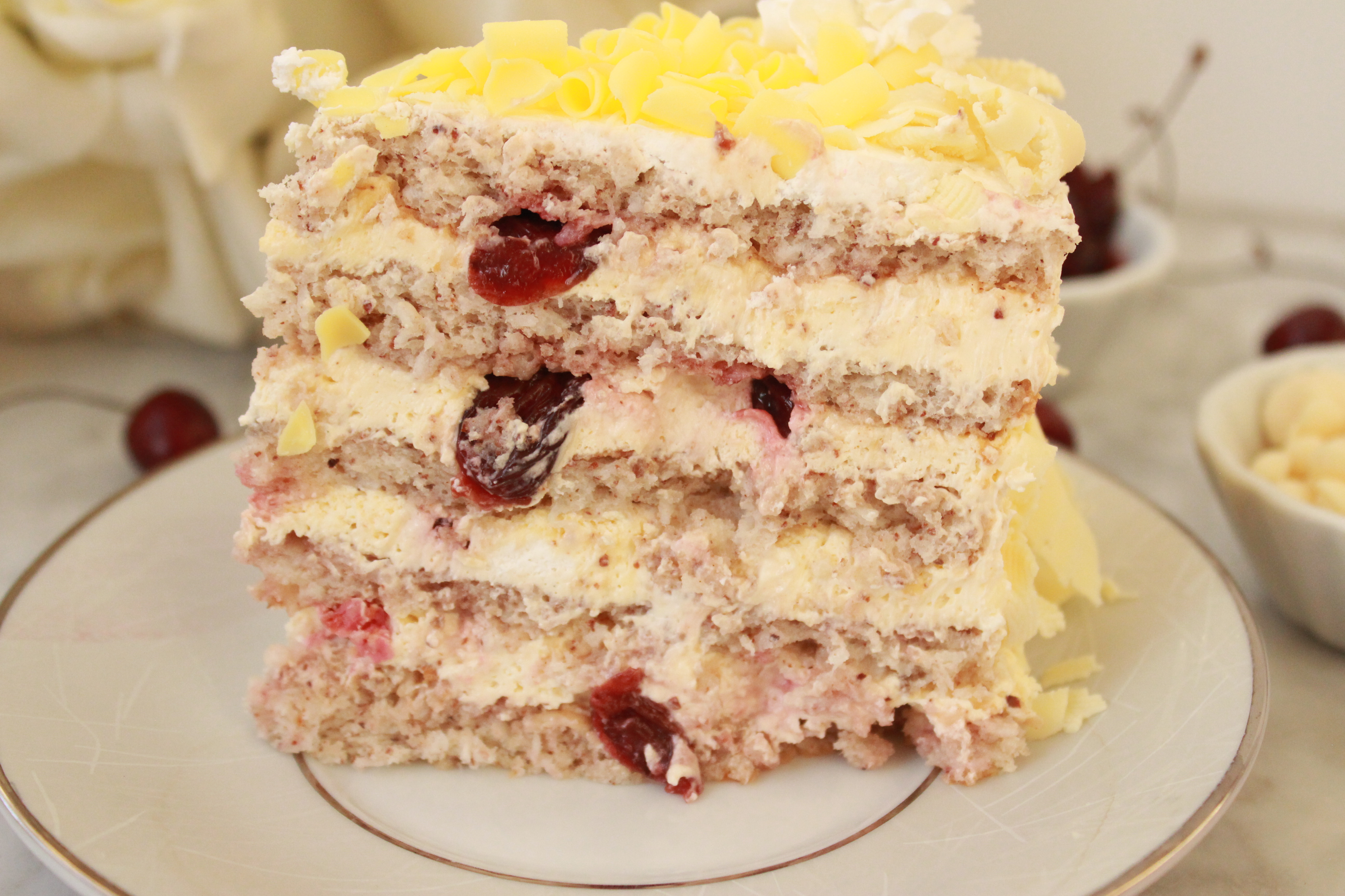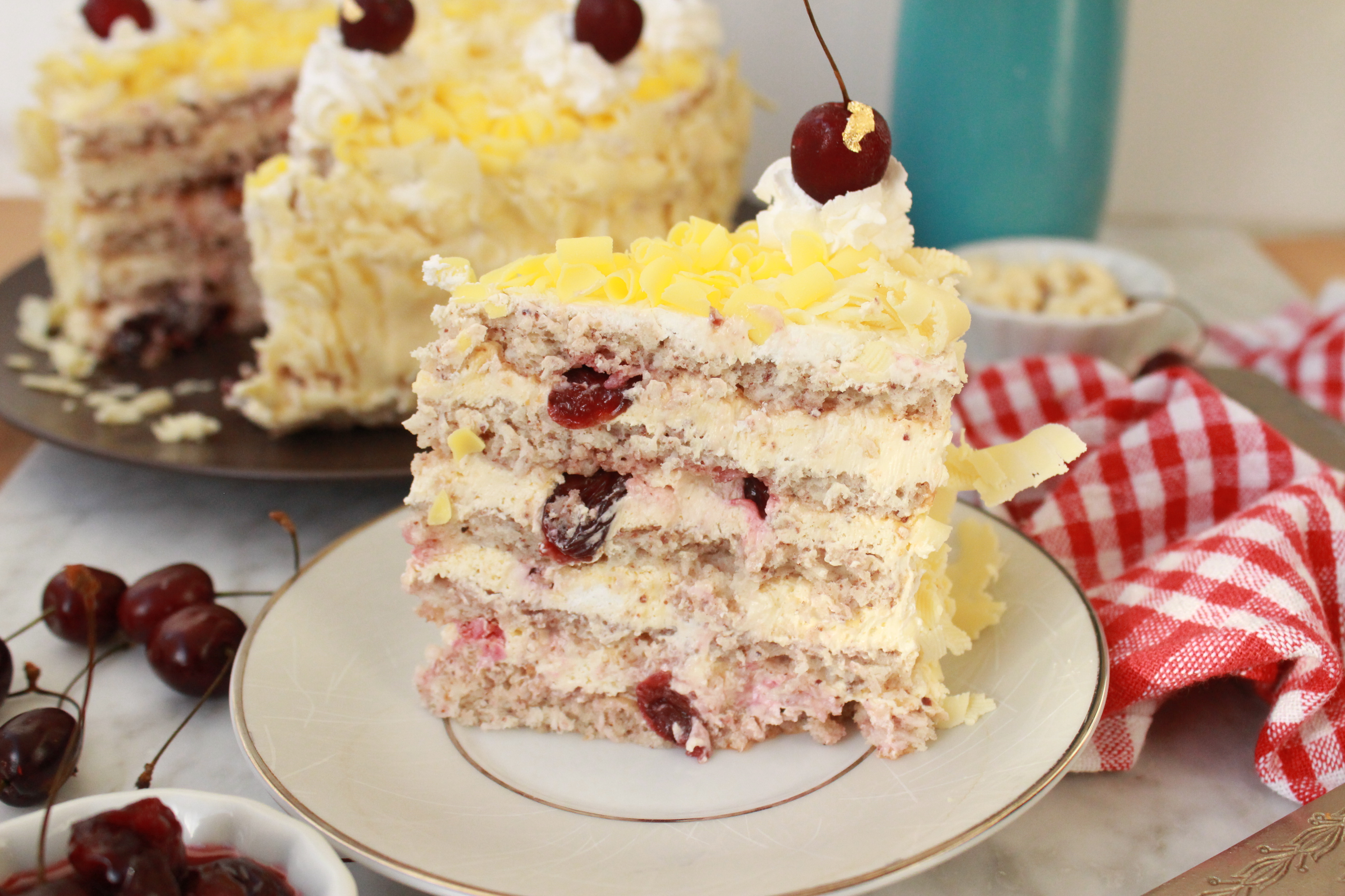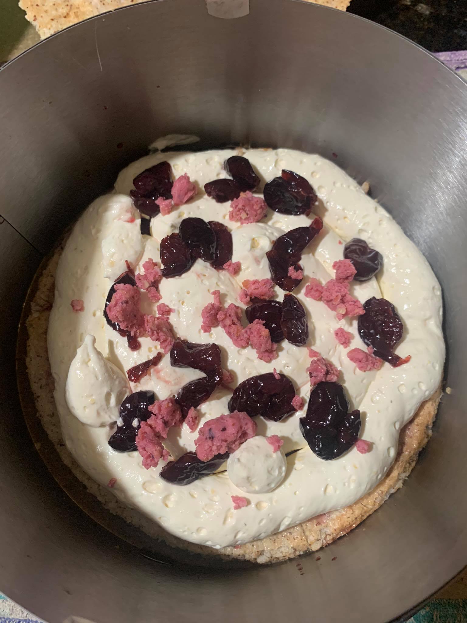 Remettre un autre biscuit, l’imbiber, déposer une couche de créme et des cerises et finir avec un biscuit imbibé.