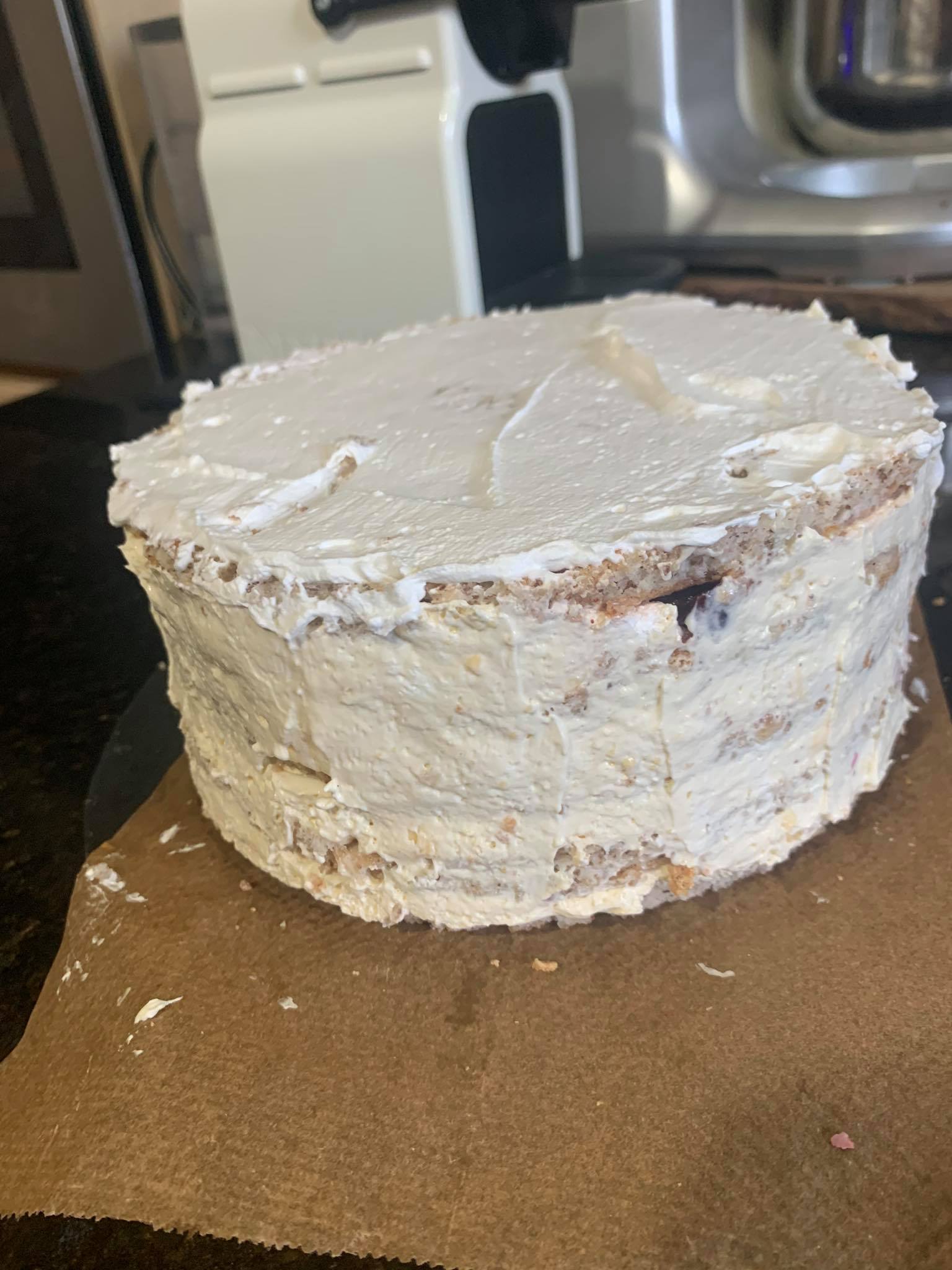 Lisser un peu les bords, mettre au frais 30 minutes, ensuite remettre une couche de chantilly sur tout le gâteau.