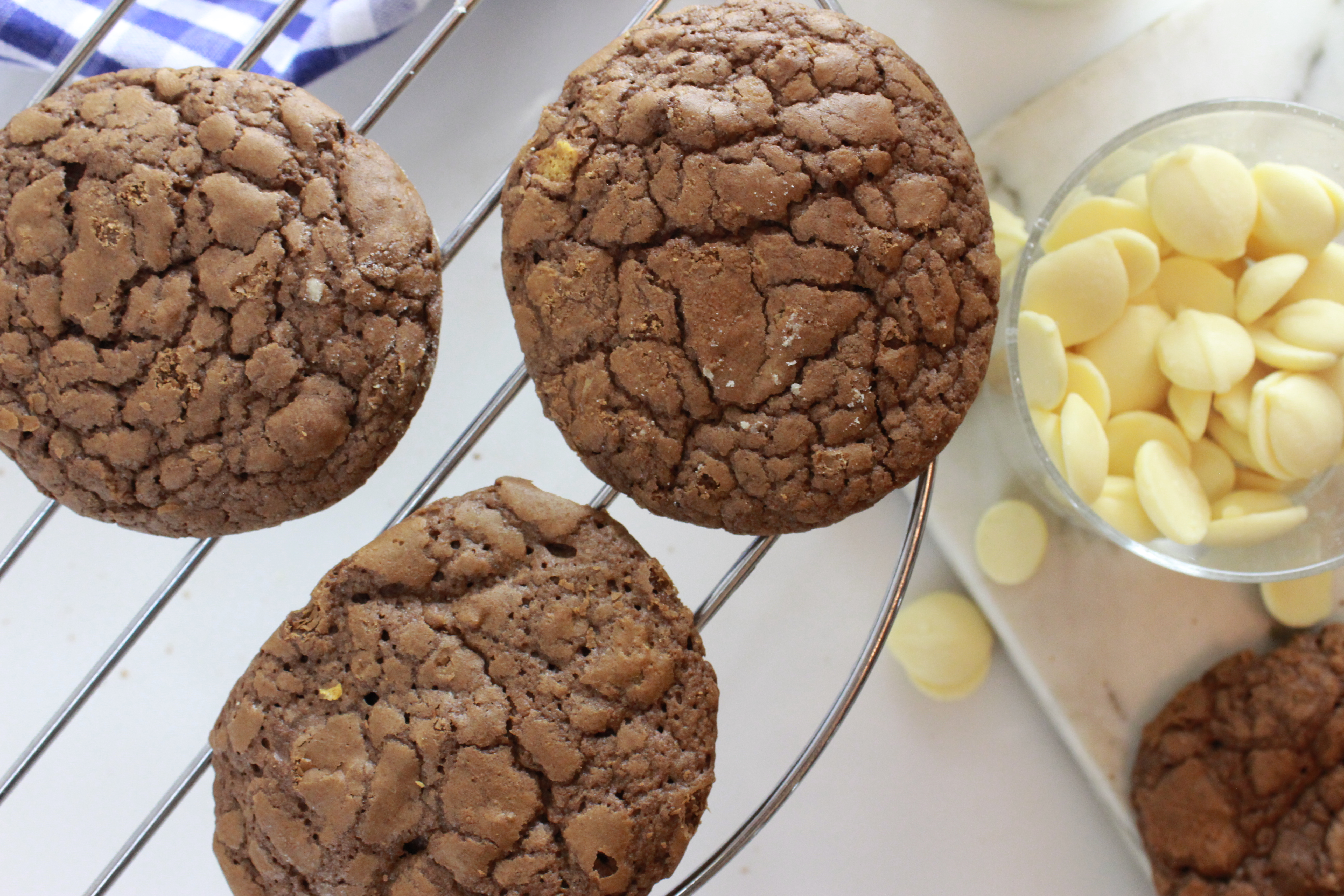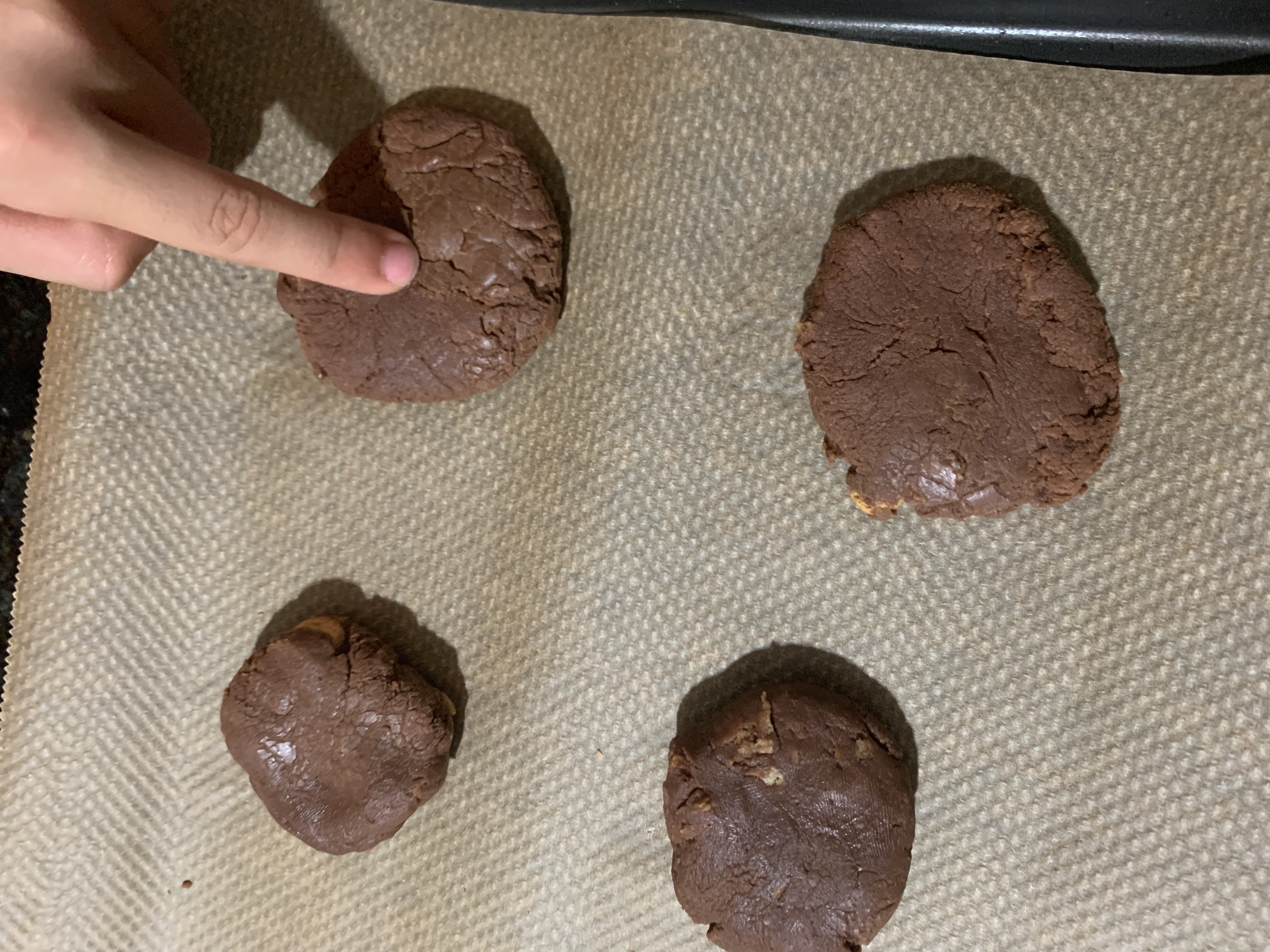 un cookie ressemble à un brownie. Il doit être "pas trop cuit". C'est-à-dire, obtenez-le quand le dessus est encore mou (touchez avec votre doigt). C'est environ 8-12 minutes, parfois plus, parfois moins - la taille décidera. si vous allez trop cuire le cookies vous allez perdre le moelleux et l'ettirement du biscuit