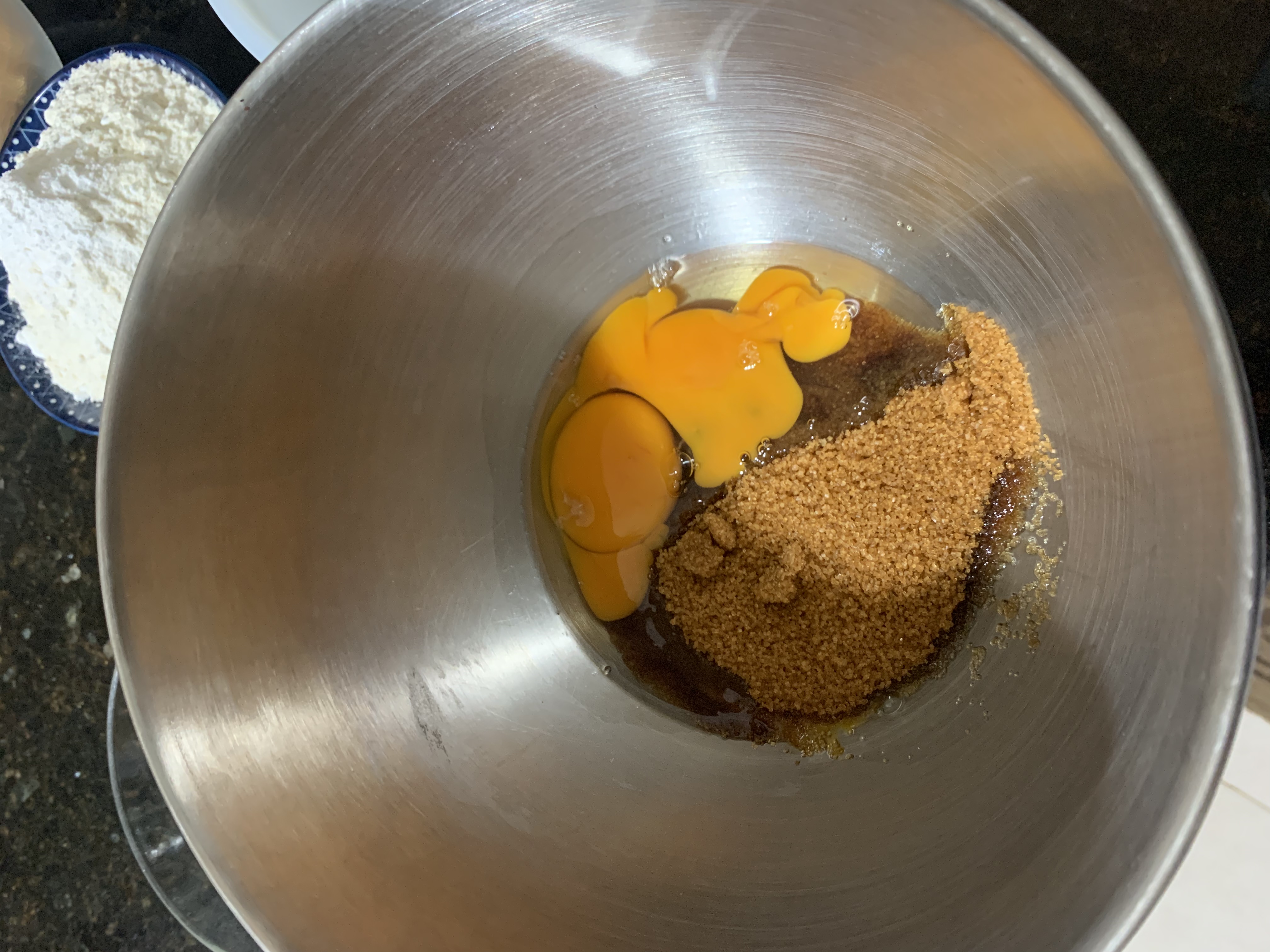 Dans un bol , battre les œufs et le sucre de canne ils doivent être battus à grande vitesse jusqu'à formation d'une mousse blanche comme neige.