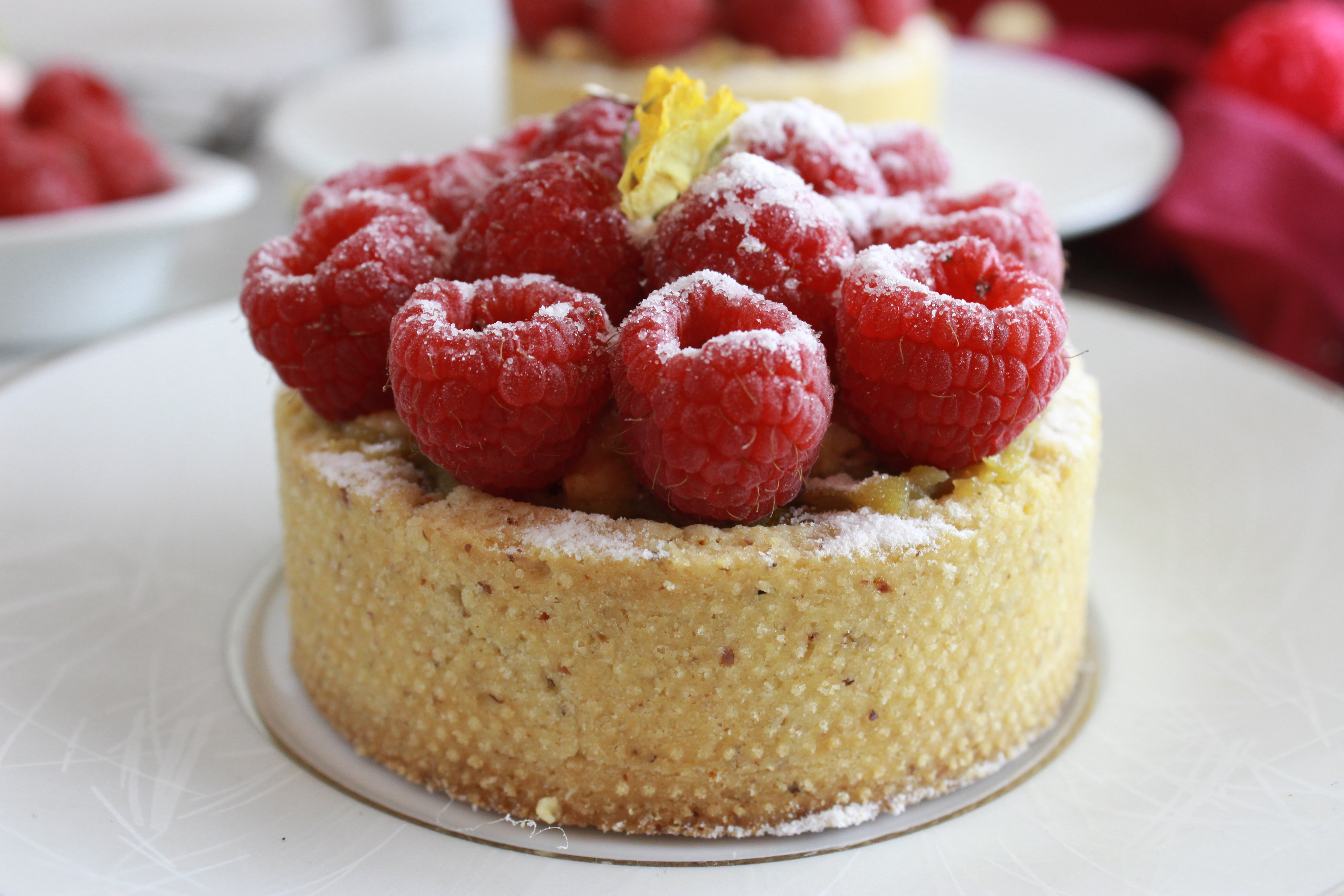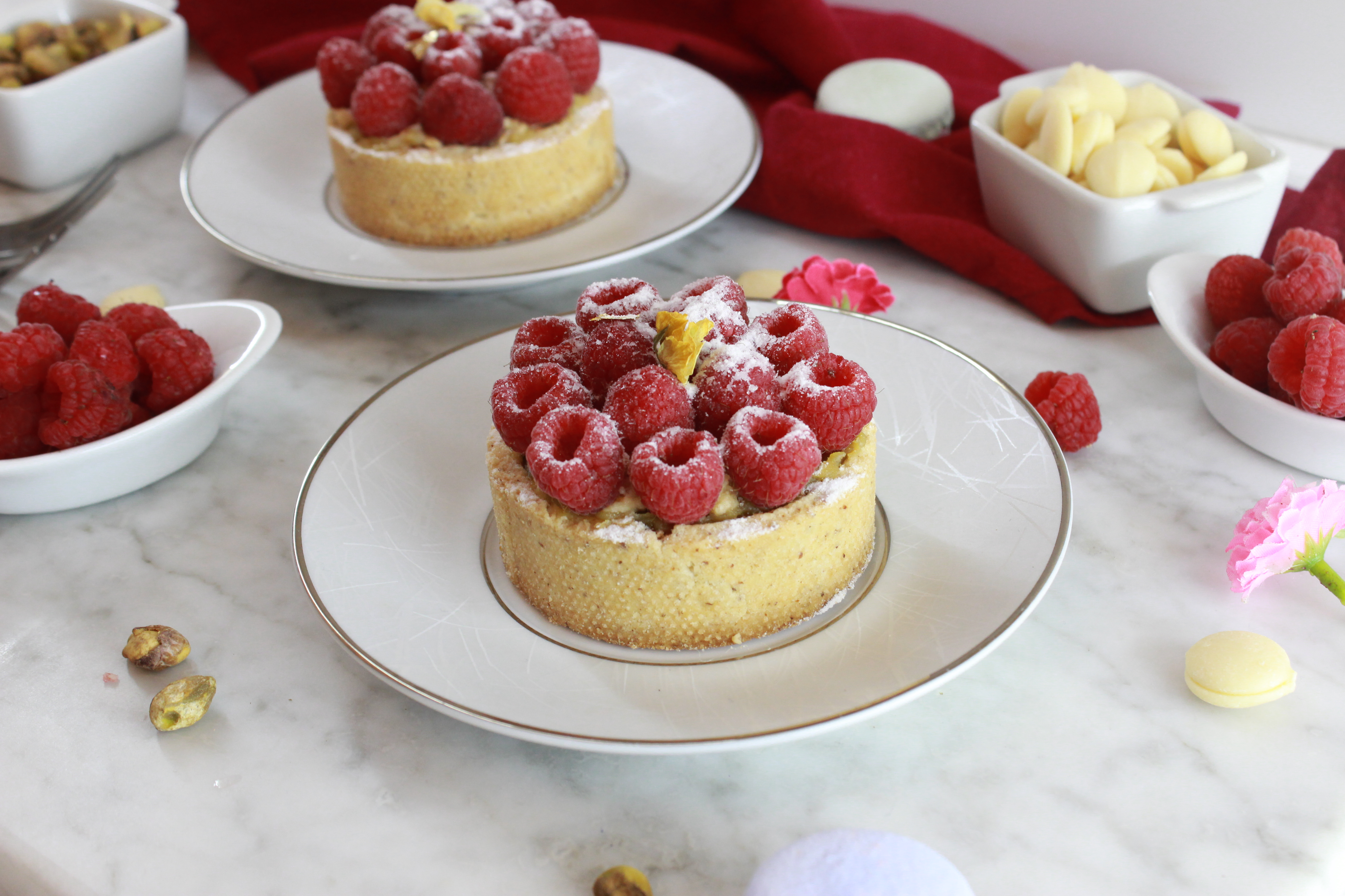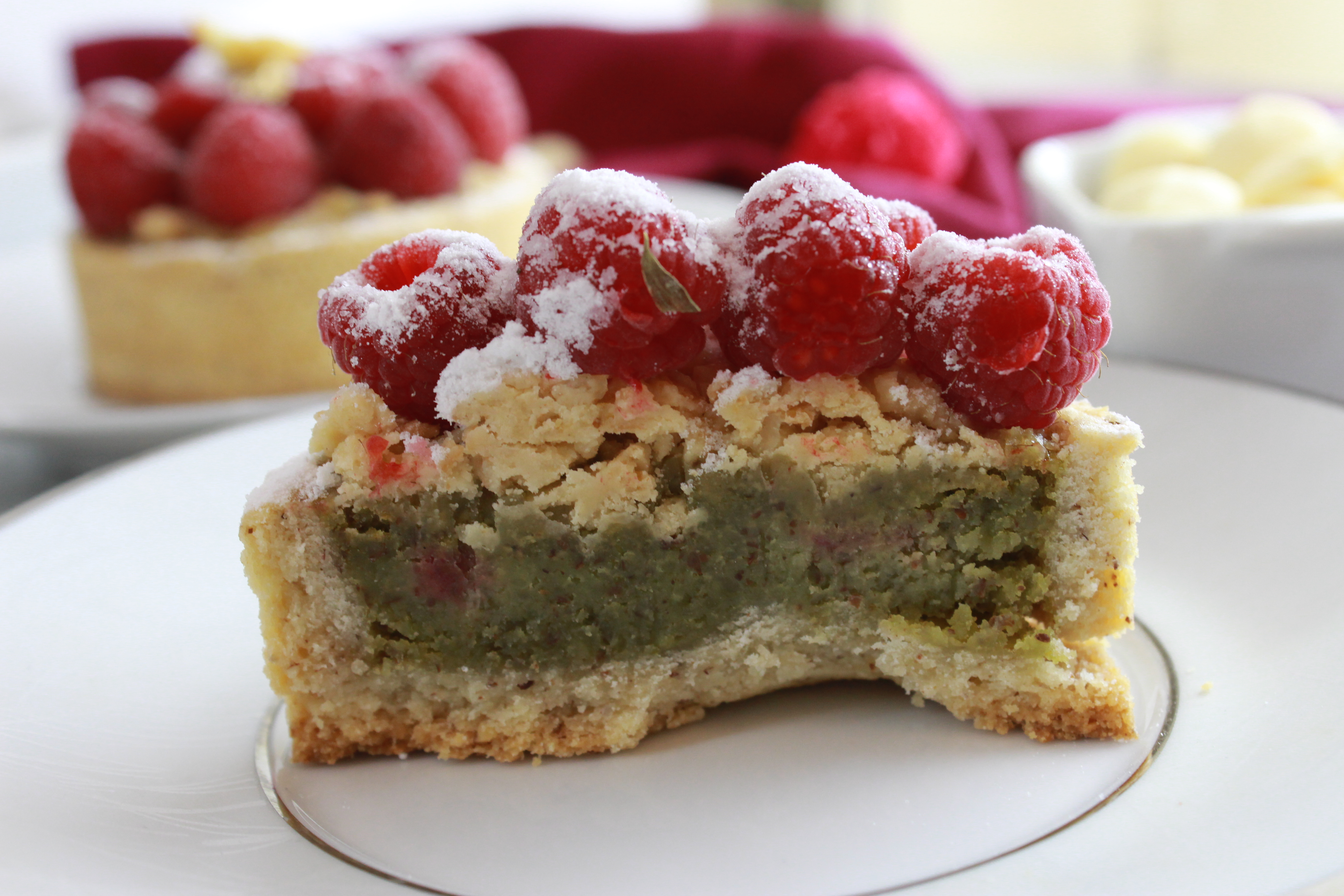 Faites bien mélanger le sucre le beurre la poudre de pistache l'oeuf Ajoutez la crème fraiche et fouettez juste pour l’incorporer .Versez la préparation dans le cercle, sur la pâte sablée disposer quelques framboises et faites cuire entre 25 minutes (le biscuit doit être bien doré).