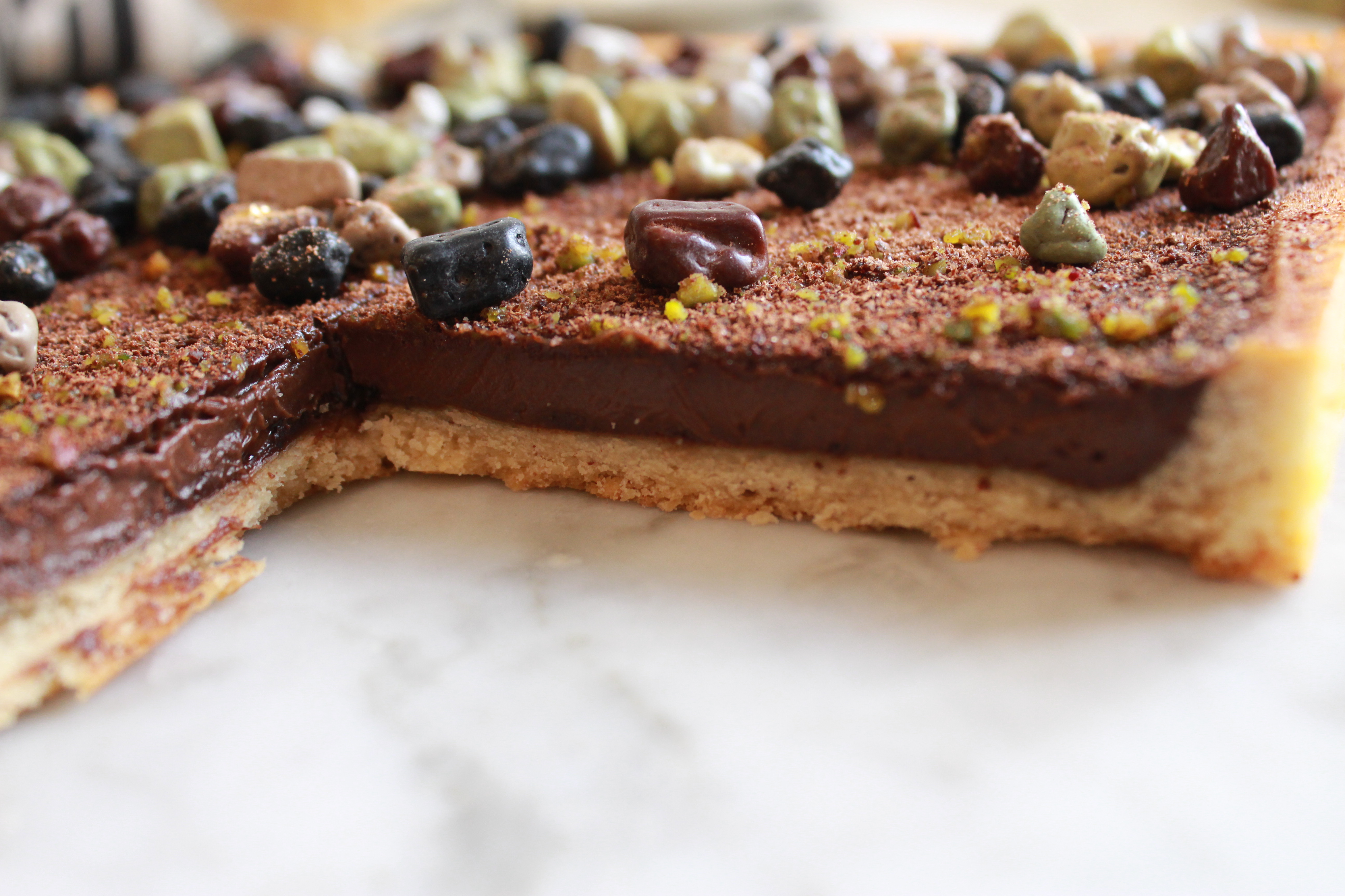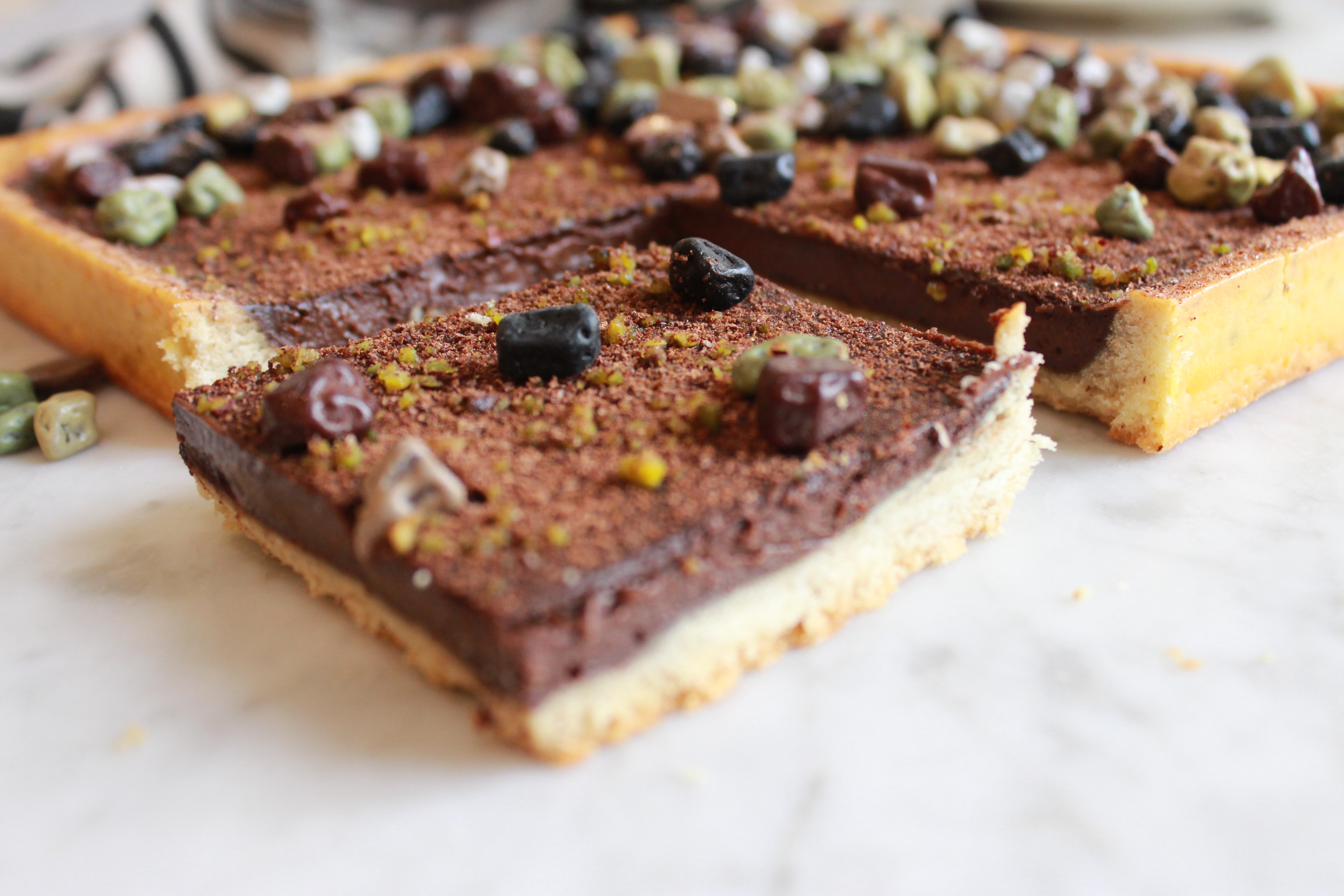 Verser la ganache sur la pâte. Faire cuire la tarte à 150° durant 15mn. La ganache doit être encore tremblotante à la sortie du four. Elle finira de cuire hors du four.