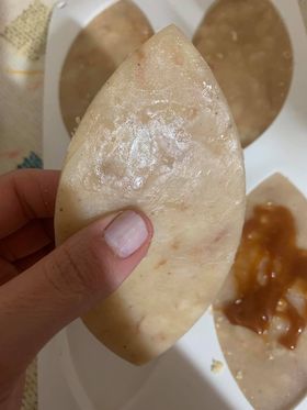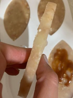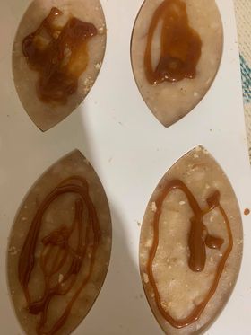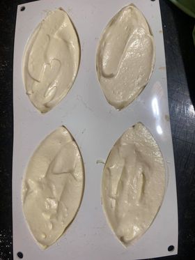 Insérez le confit de poire congelé (le confit de poire j'ai collé dessus une couche de biscuit cuillére avec du caramel pour avoir 2 couches de biscuits )