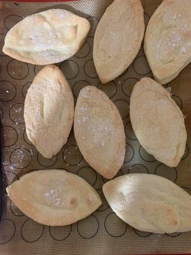 Pocher sur une feuille de papier cuisson 2 disques Avant d’enfourner, poudrer 2 fois de sucre glace à 5min d’intervalle les bandes pour l’extérieur de Enfourner 10 min à 200° à surveiller. Démouler avec précaution. Laisser refroidir.